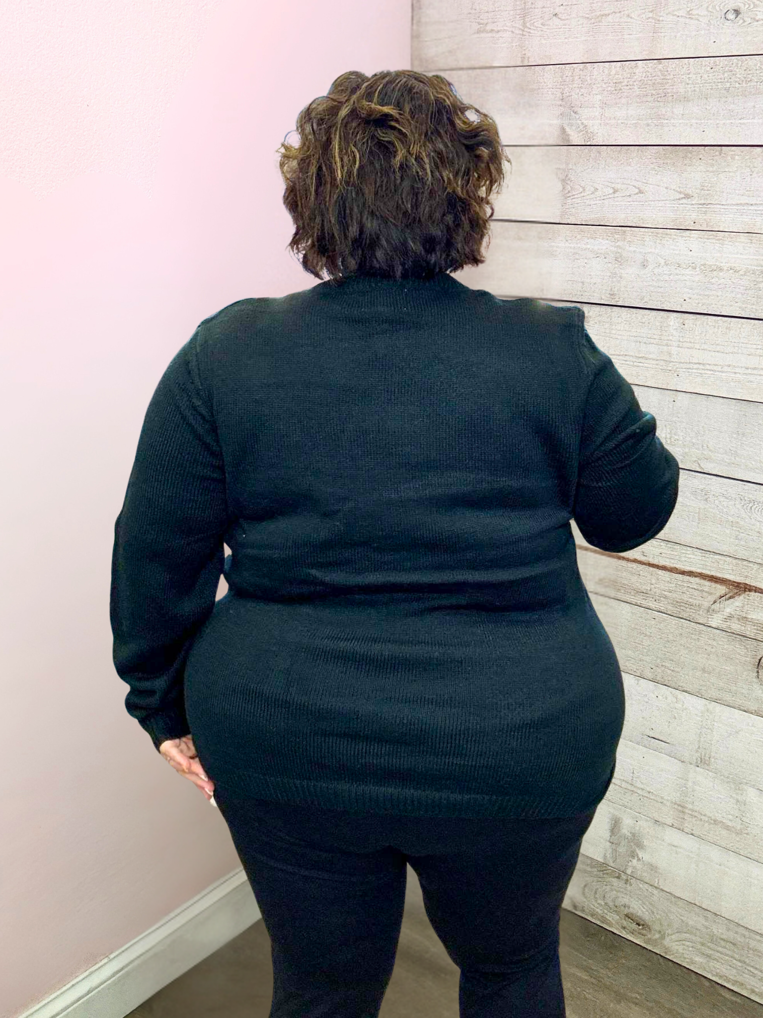 The extended size model is 5'3 and is wearing a 2X.