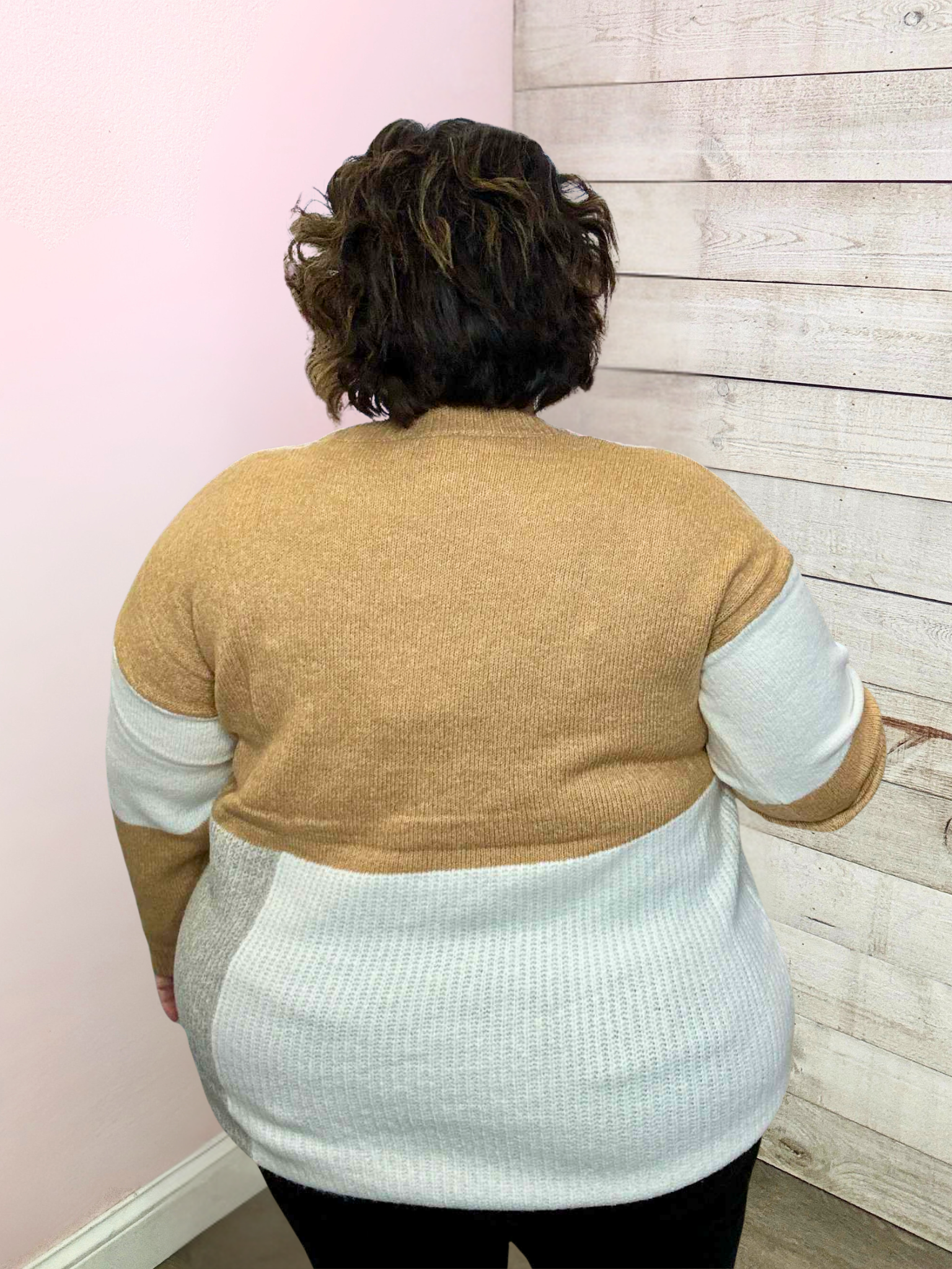 Brown, grey, and cream colorblock sweater featuring a crew neckline, long sleeves, and a straight hemline.