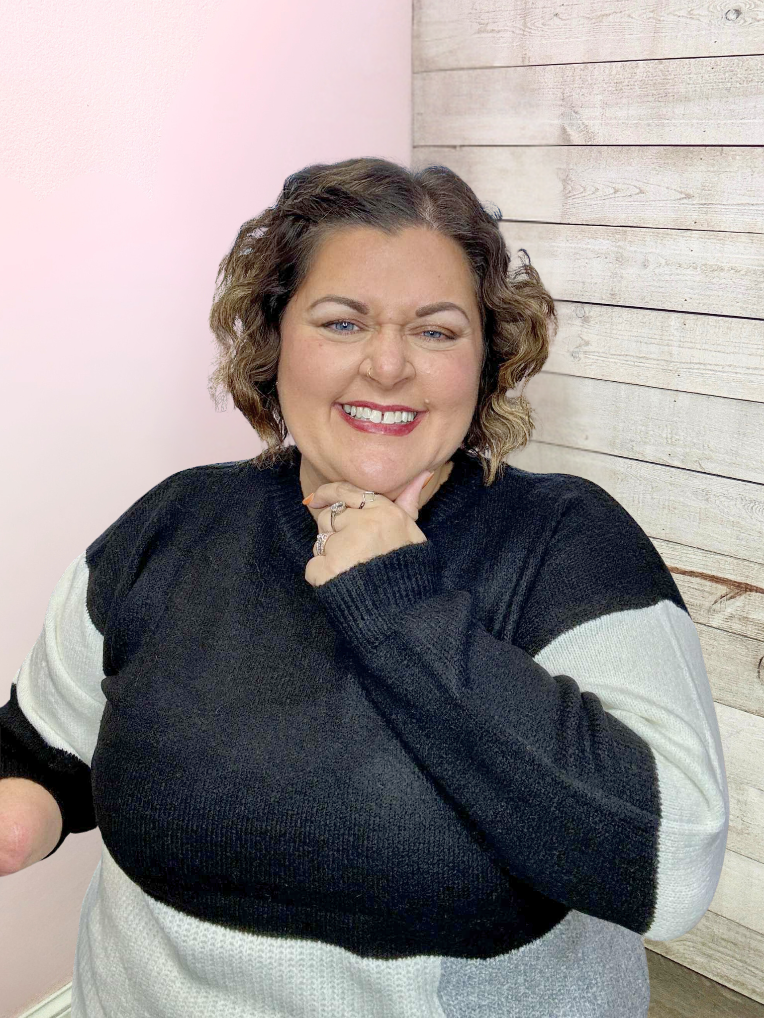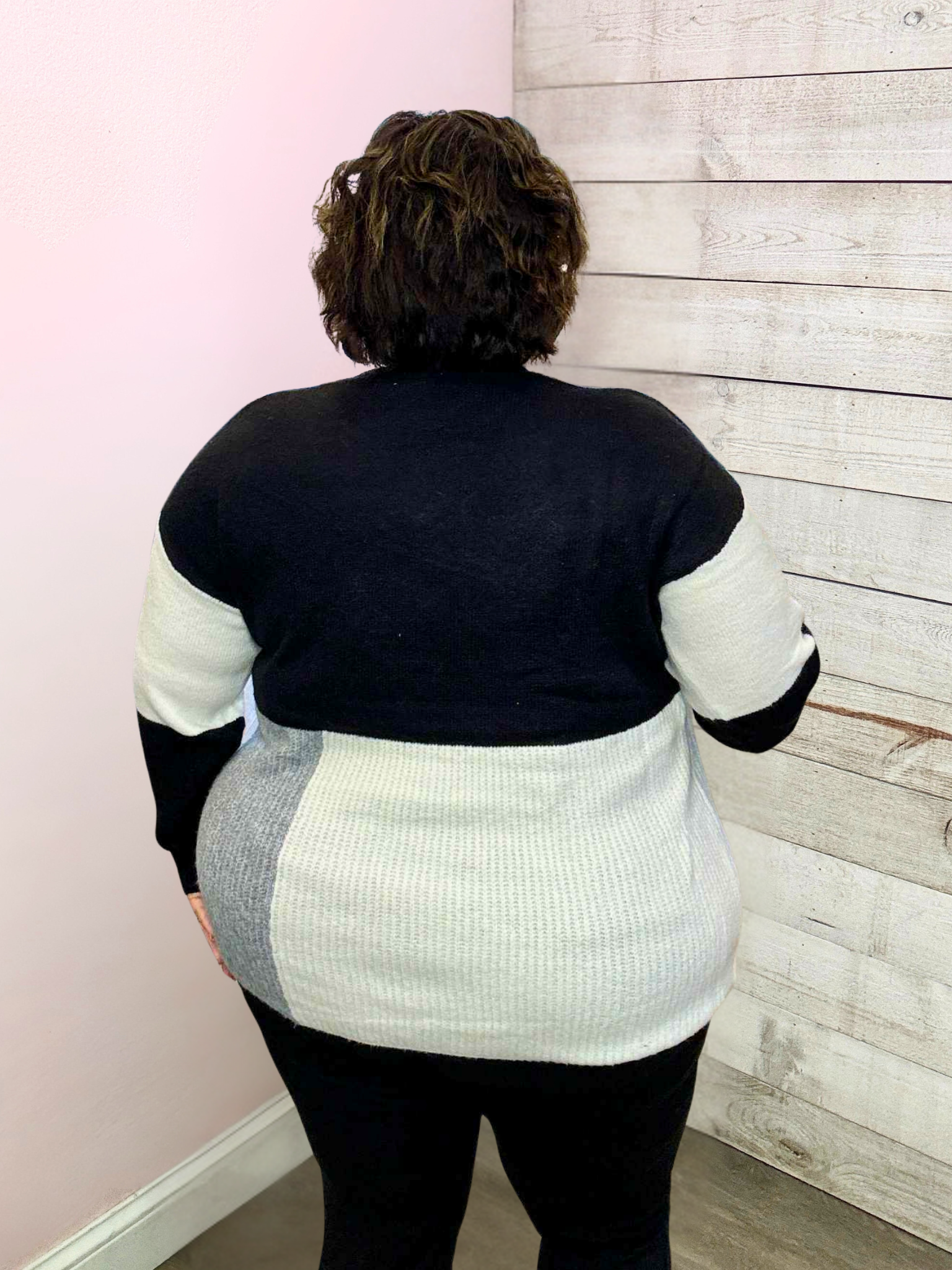 Black, grey, and cream colorblock sweater featuring a crew neckline, long sleeves, and a straight hemline.