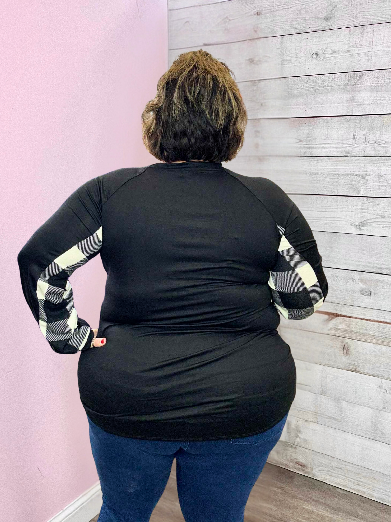 Black top with plaid contrast featuring a round neckline, long sleeves, and a dolphin hemline.