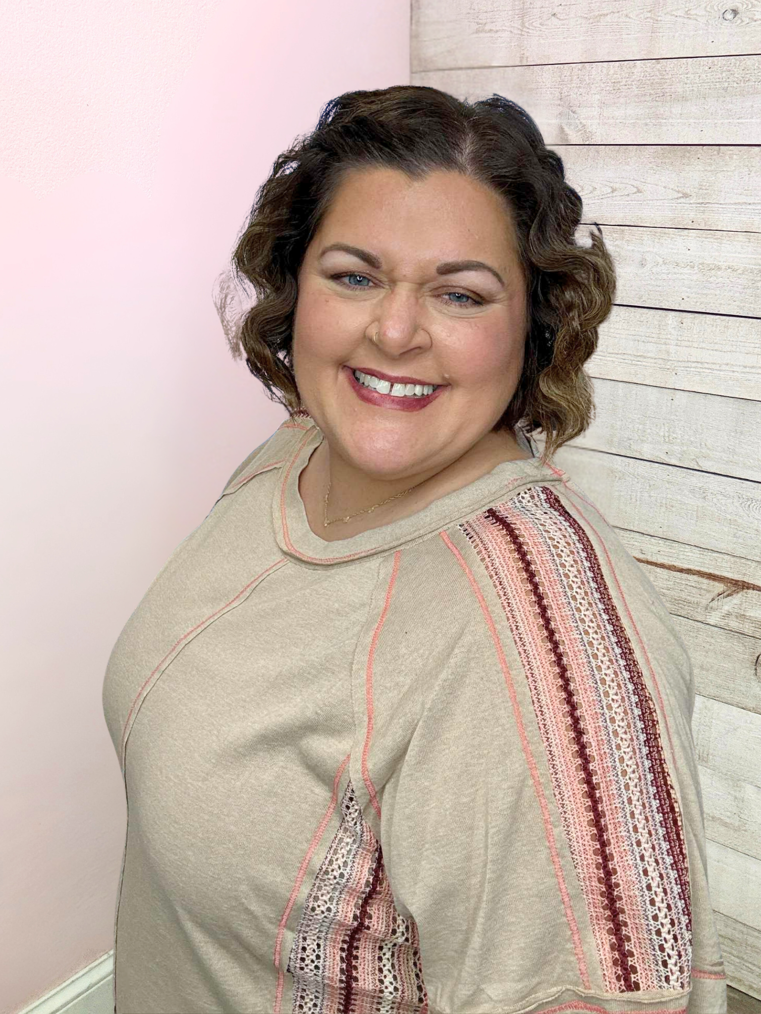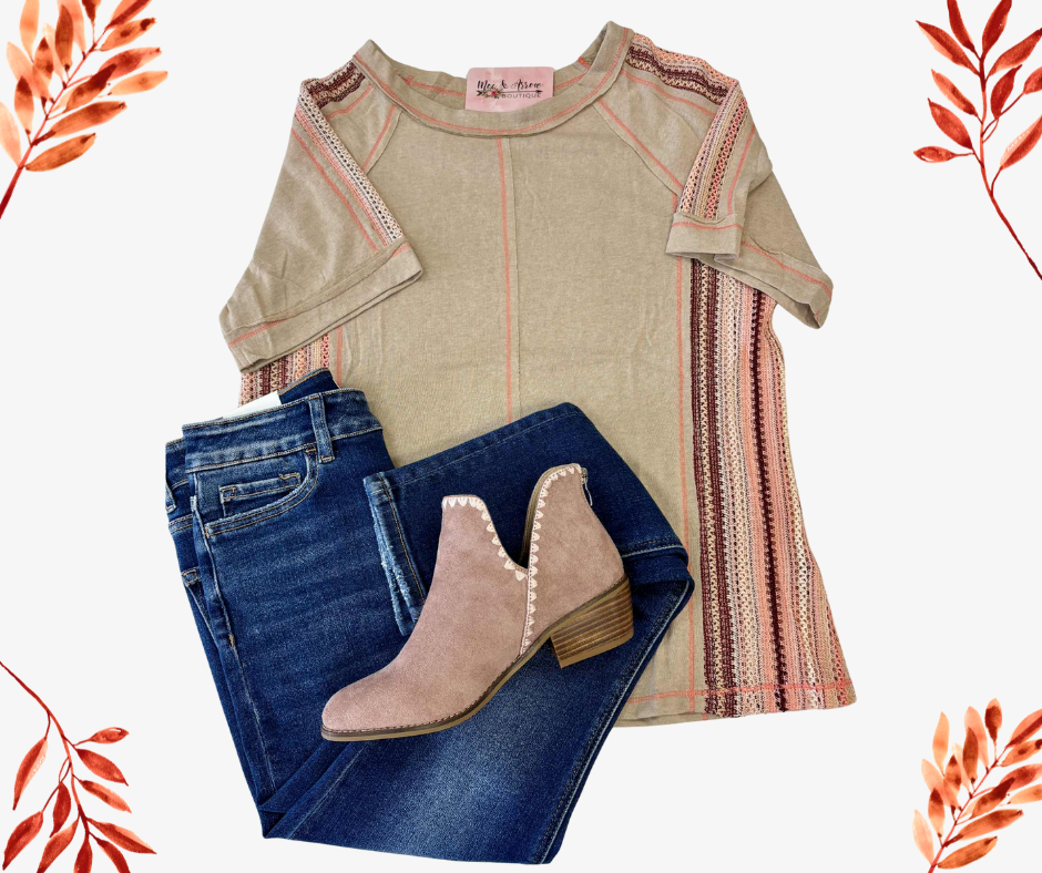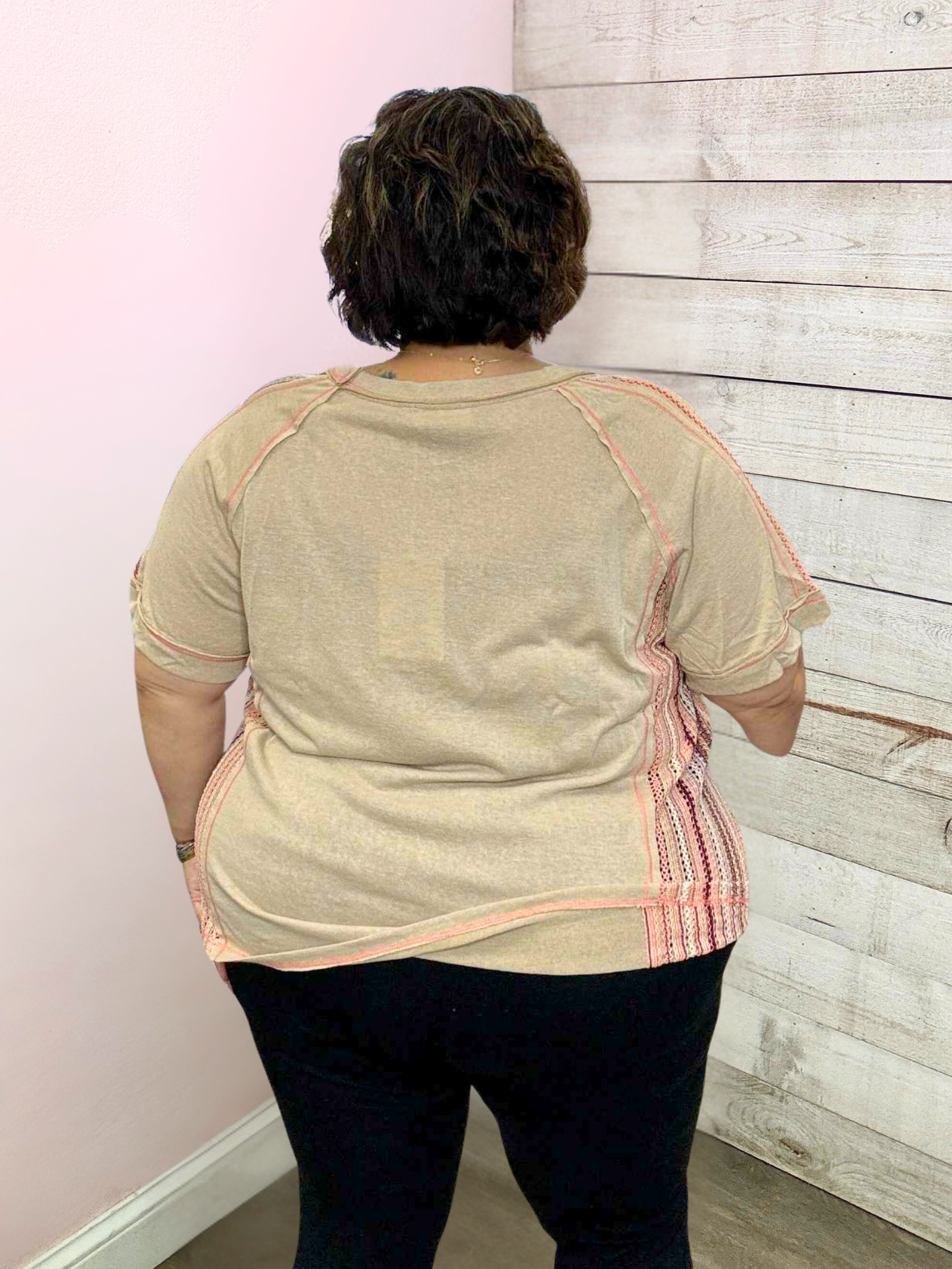 Tan top with pink crochet sides and shoulders. Featuring a round neckline, short sleeves, exposed stitching, and a straight hemline.