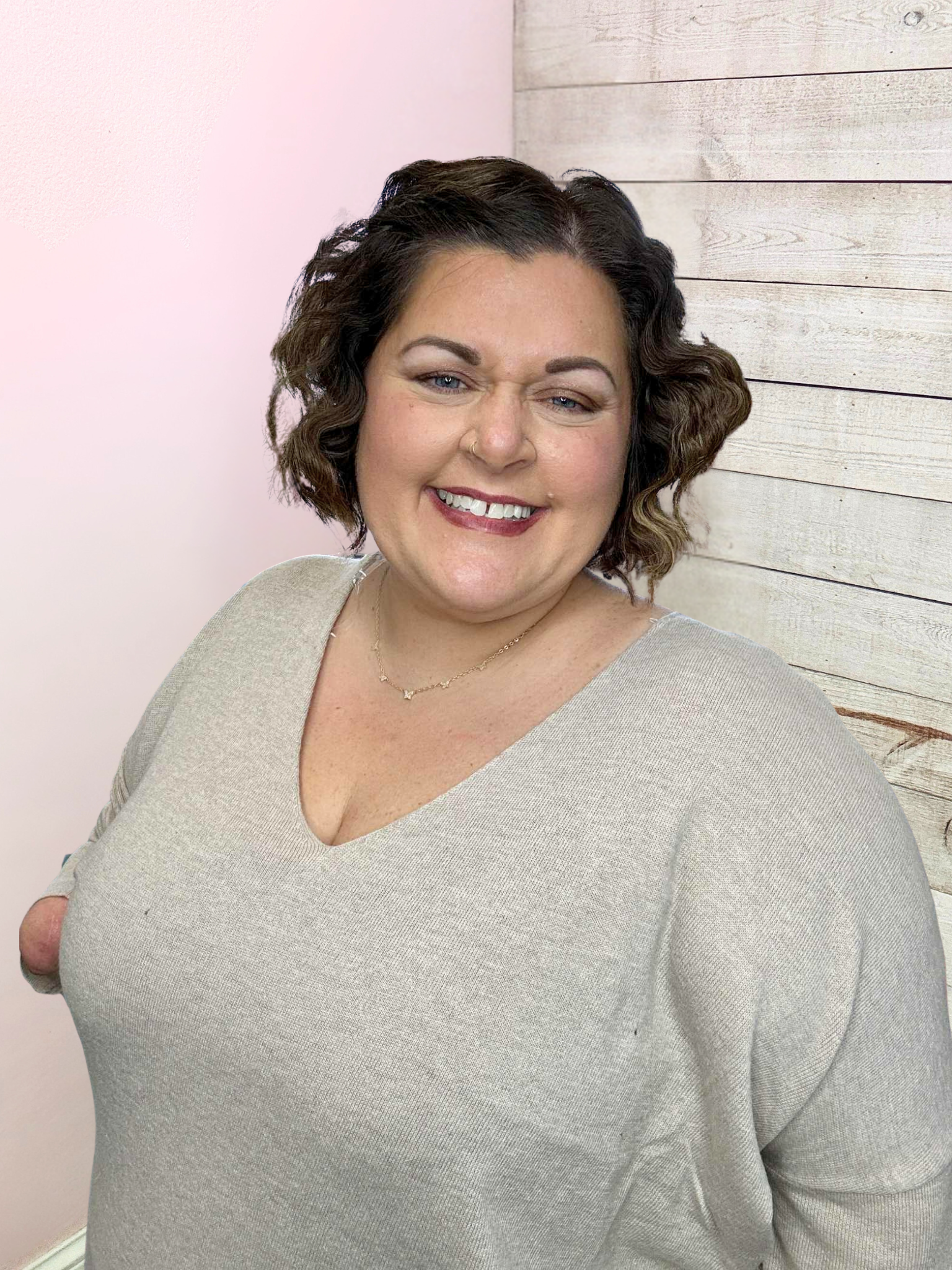 The extended size model is 5'3 and is wearing a 1X.