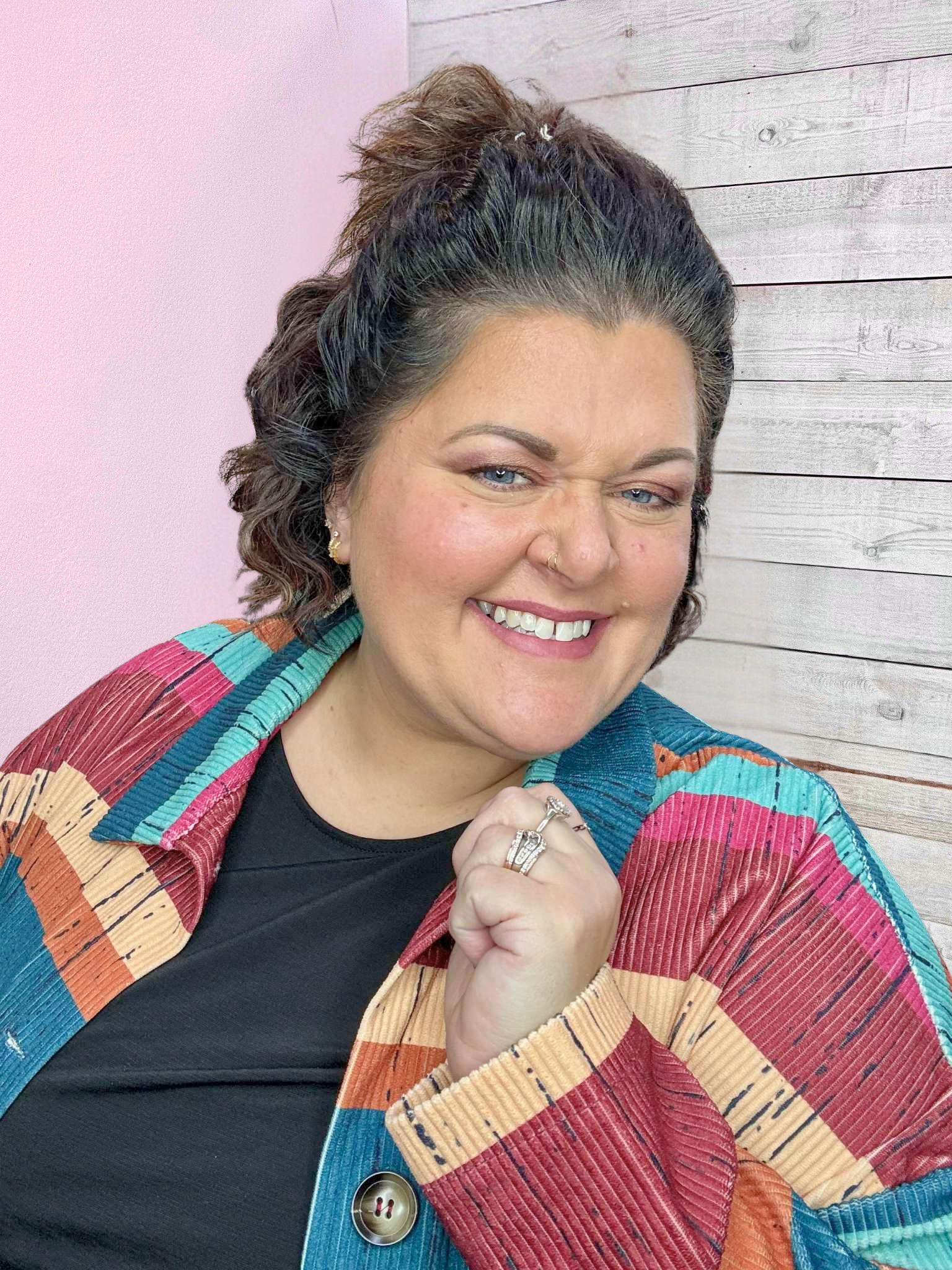 The extended size model is 5'3 and is wearing a 2X.