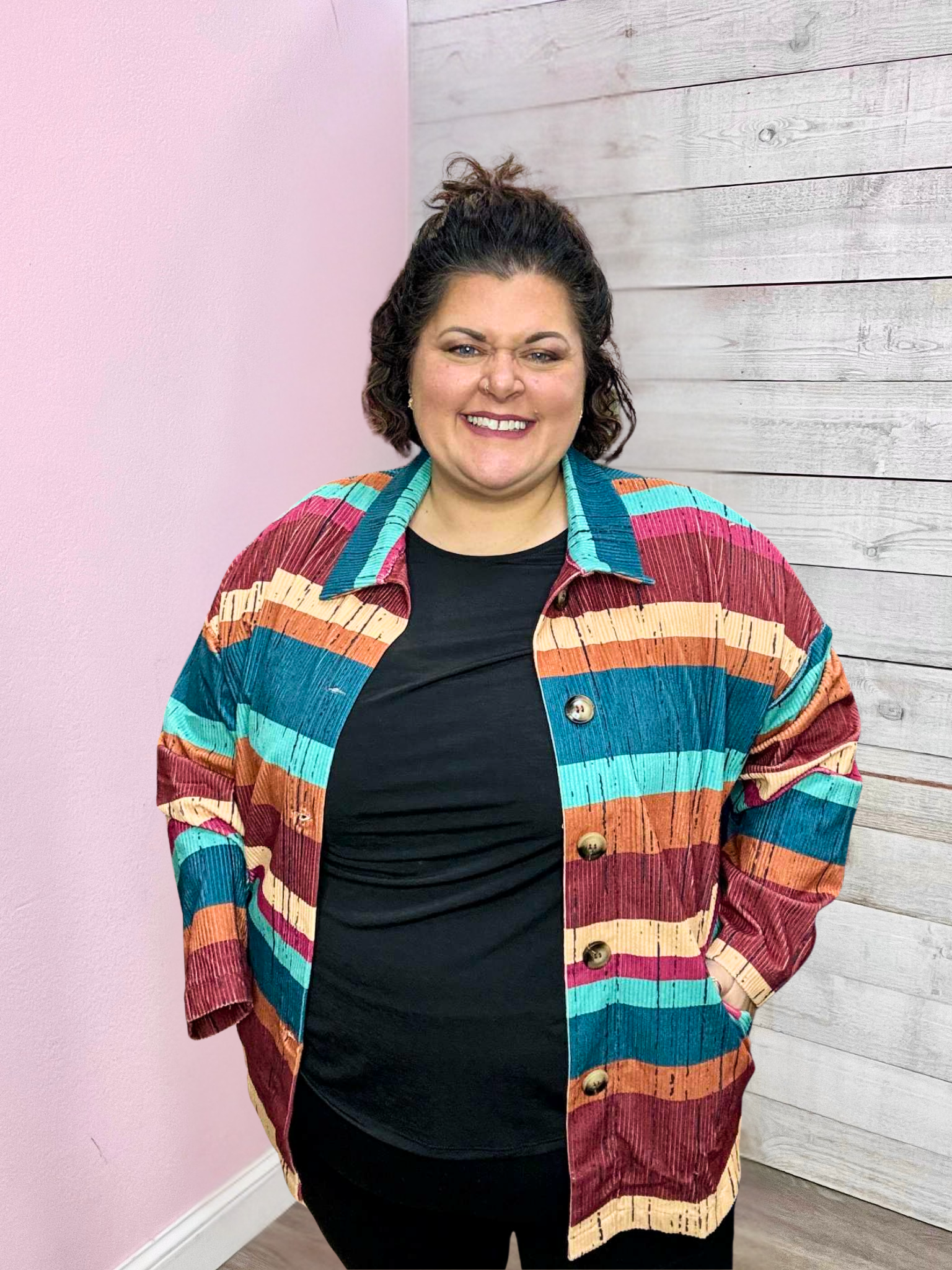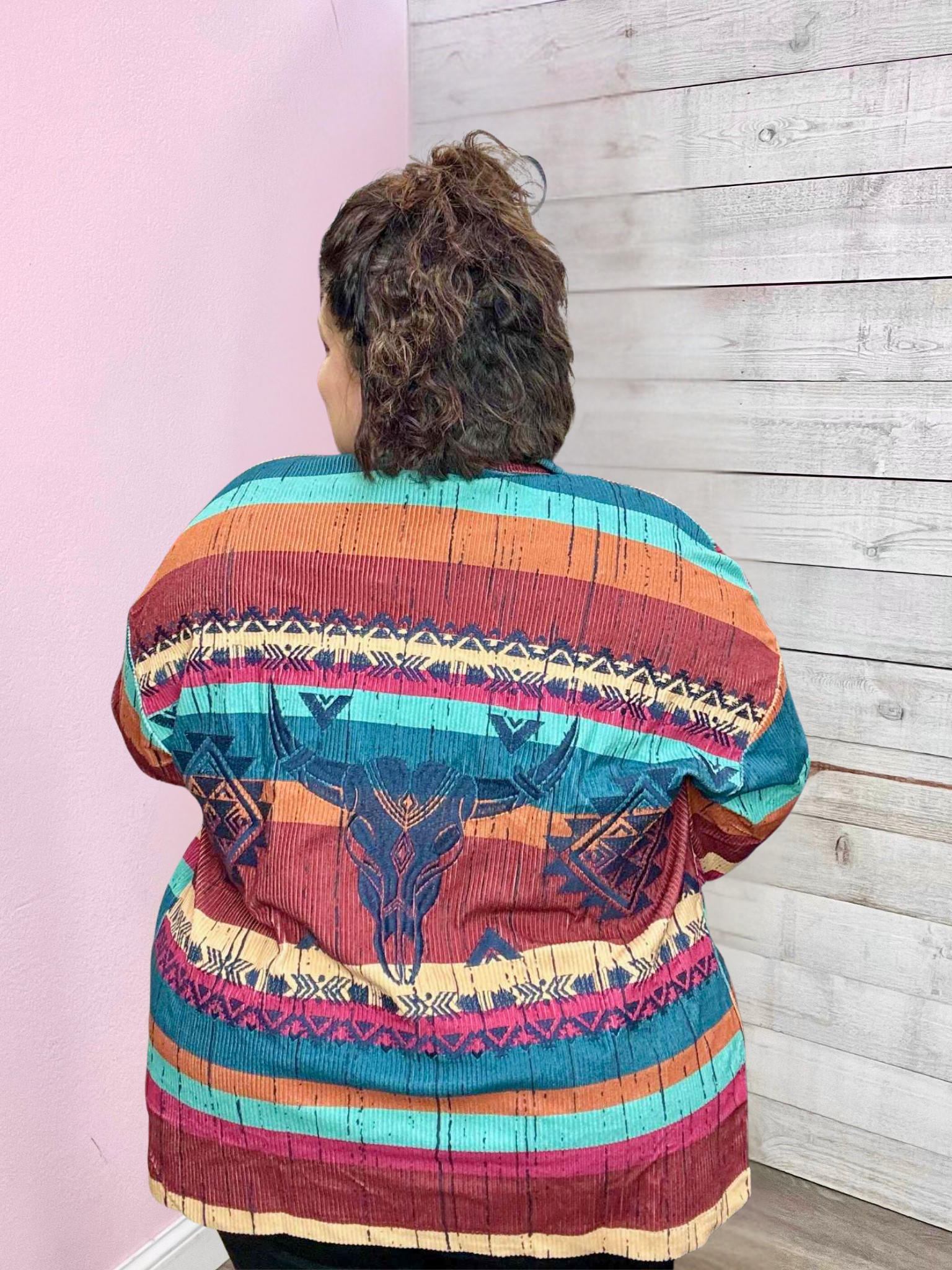 Ribbed multi-color striped jacket featuring a collared neckline, button-down front, long sleeves, side pockets, and a straight hemline. Embroidered longhorn on the back.