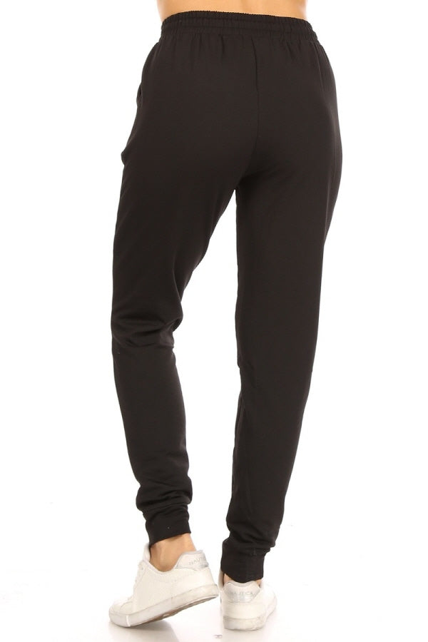 Solid black, fleece-lined, relaxed-fit joggers featuring a drawstring waistband and pockets.