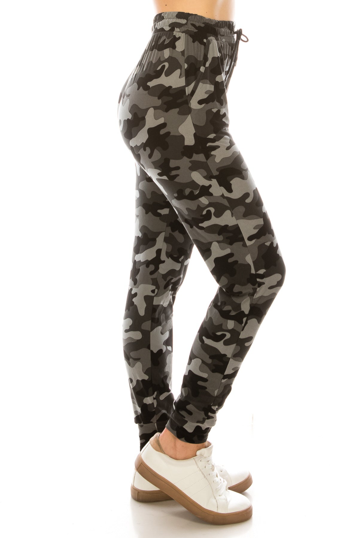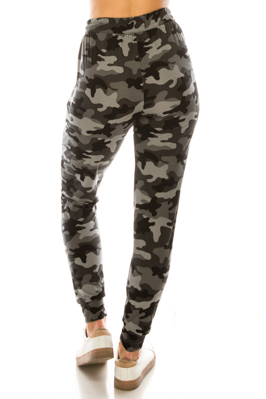 Buttery soft camo print relaxed fit joggers featuring an elastic waistband with functional drawstring and pockets.