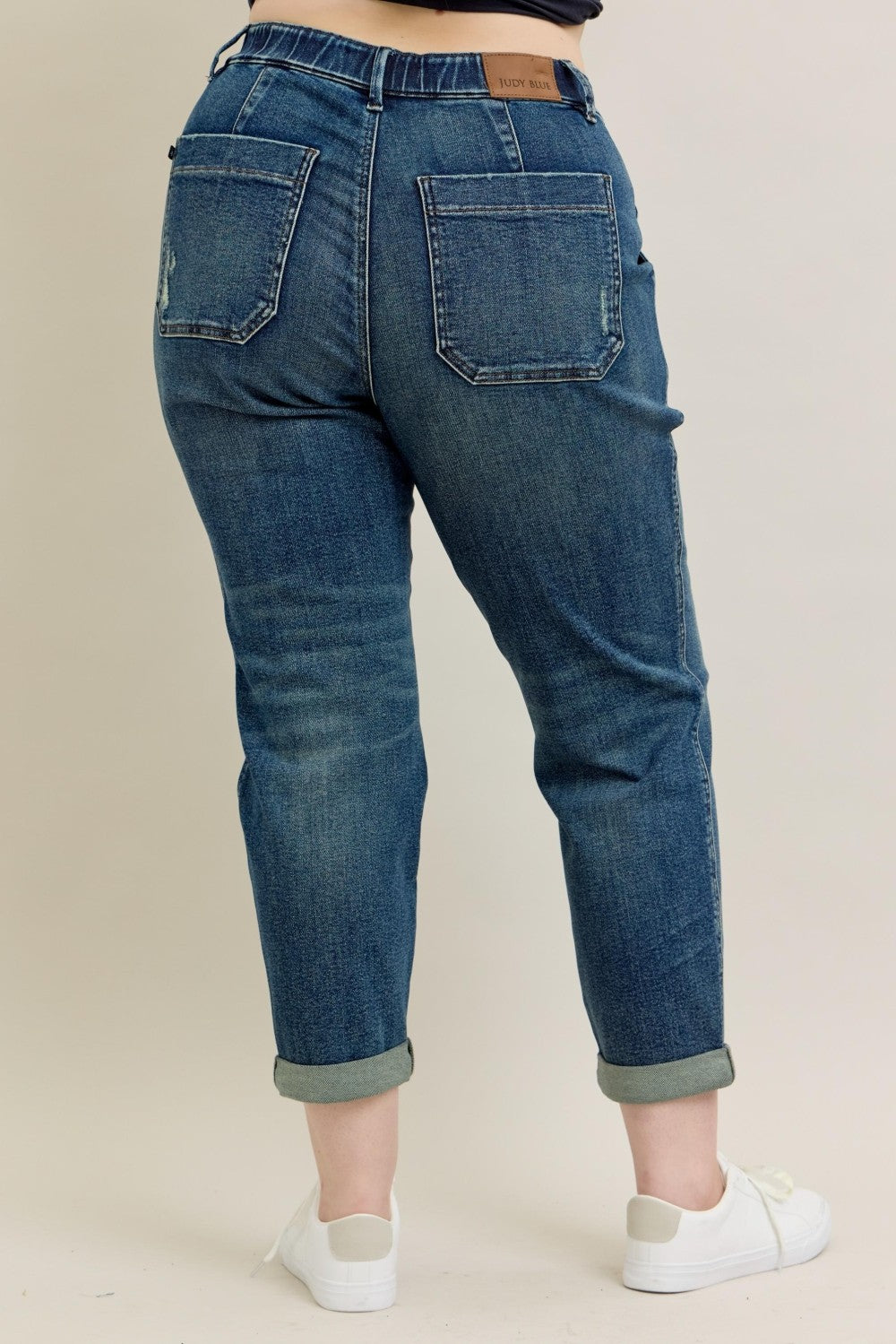 Judy Blue high waist jogger with a navy drawstring. NO distressing. Dark wash.