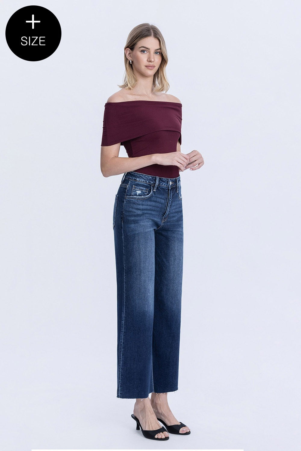 Lovervet tummy control super high-rise wide-leg jeans. NO distressing. Raw hem. Dark wash. Comfort stretch denim. Tummy control feature with inner panels for shaping and smoothing.