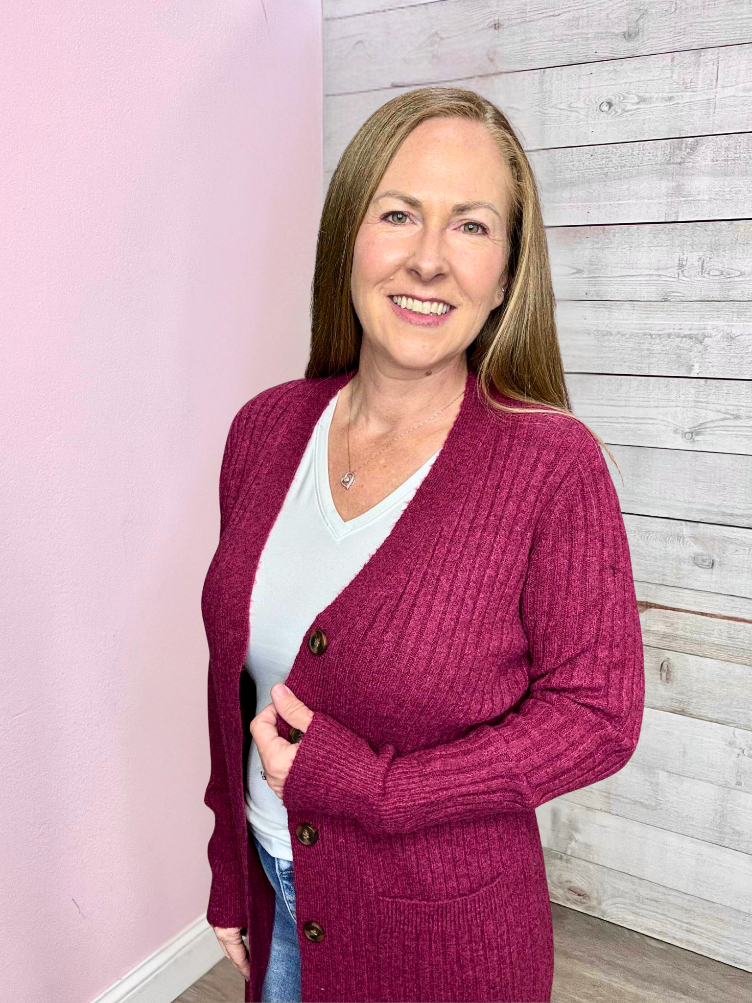 Wine colored duster cardigan featuring a button-down front, long sleeves, front pockets, and a straight hemline. Ribbed texture. Perfect layering piece!