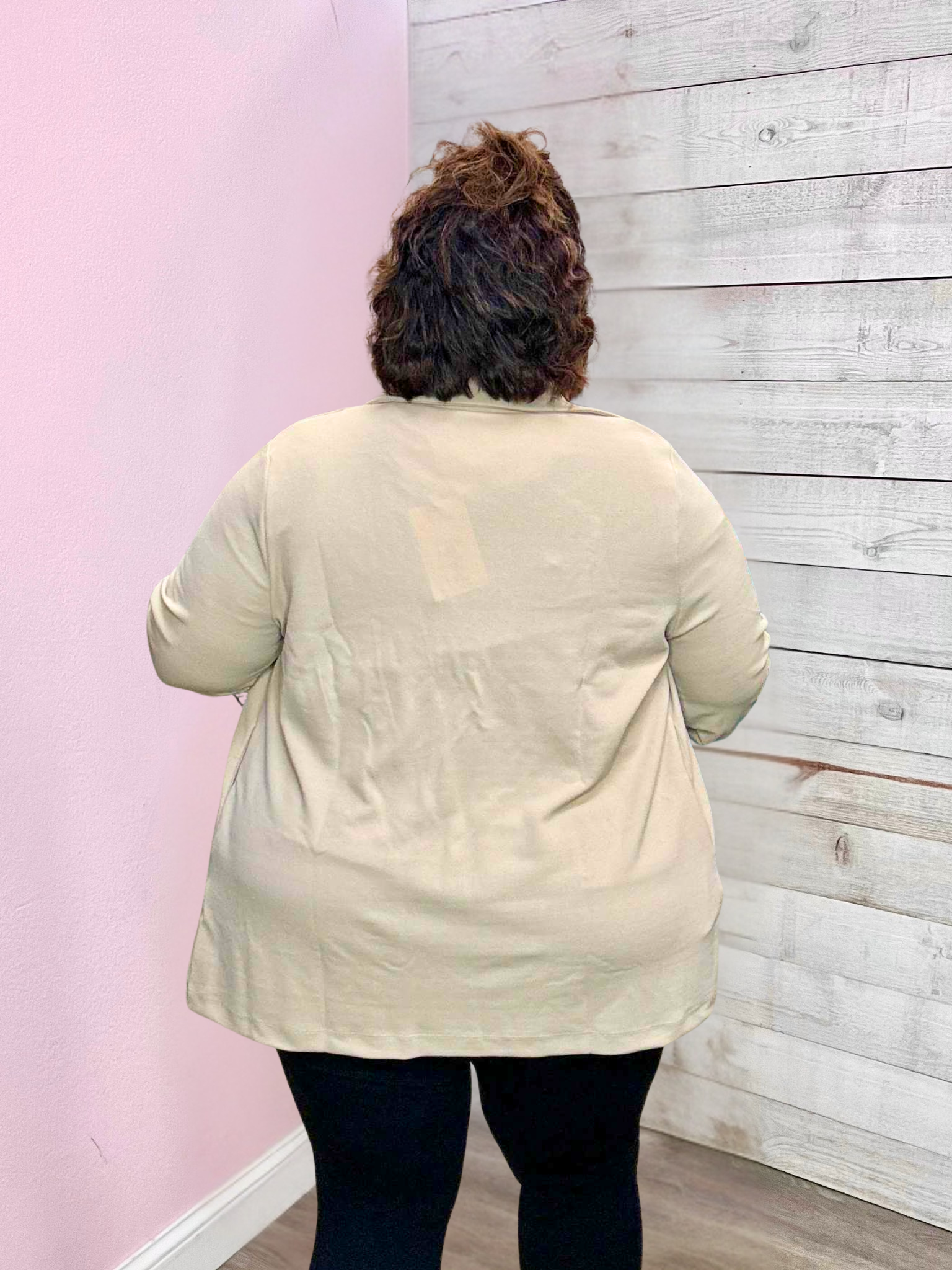 Taupe blazer with a collared neckline, open front, three-quarter sleeves with button detail, side pockets, and a straight hemline.