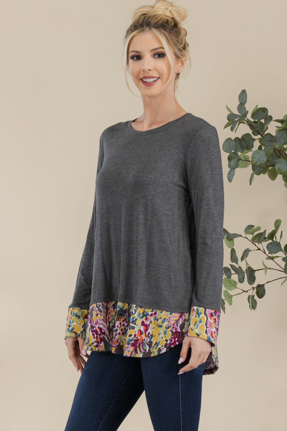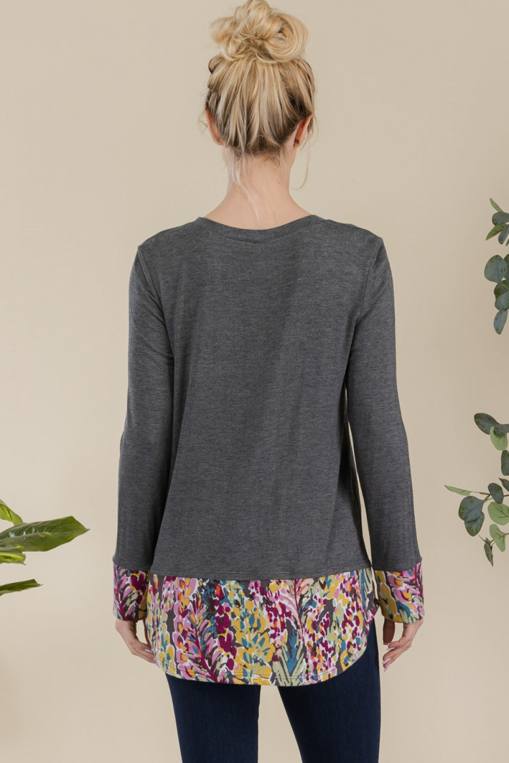 This adorable top is so soft and flowy with colorful print detail on cuffs and hemline. It brings a beautiful pop of color. Features a round neckline, long sleeves, and a curved hemline. Style with your favorite accessories. Or with leggings, jeans, a skirt, and shorts to make an effortlessly beautiful outfit.