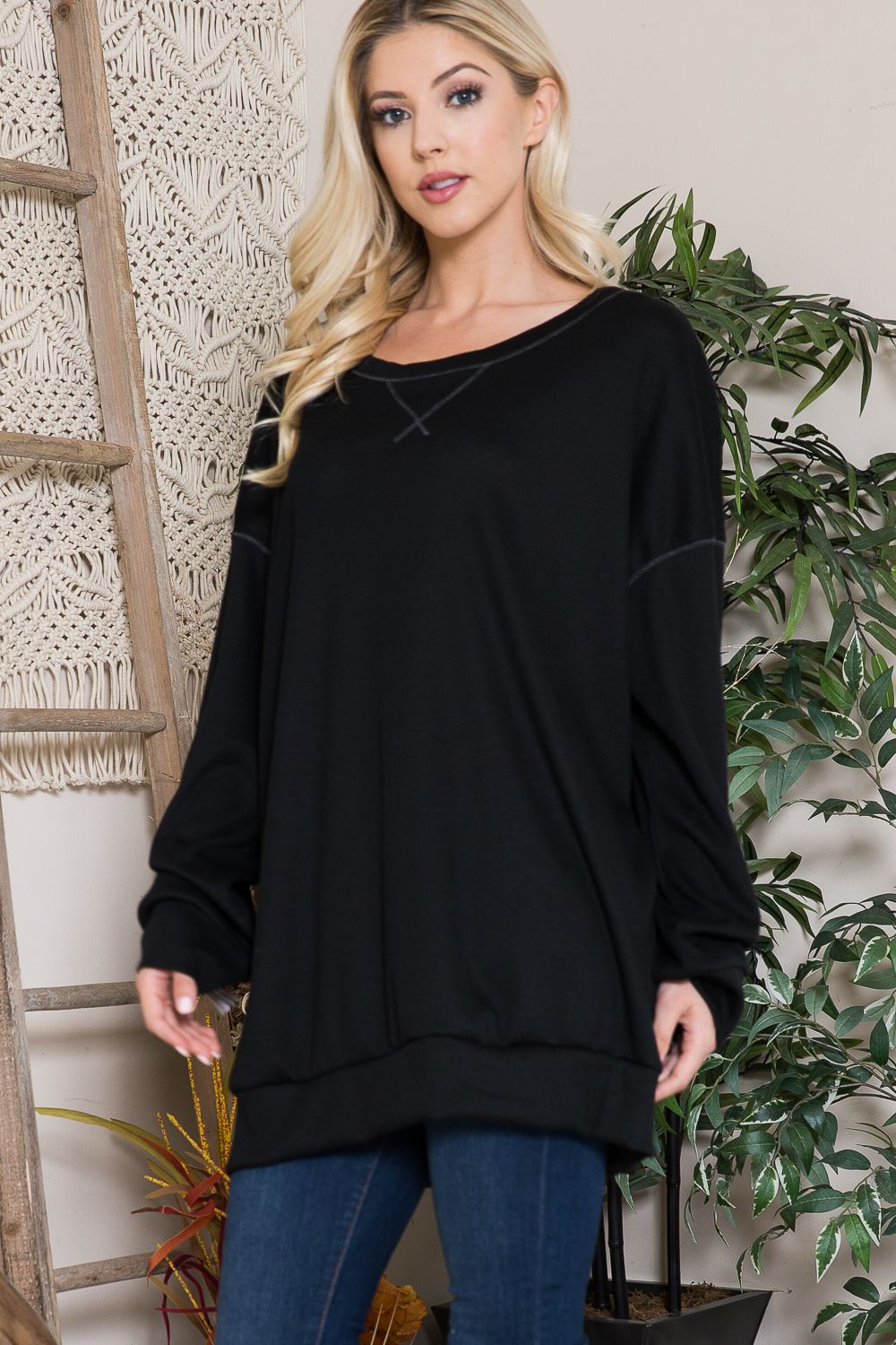 Oversized thermal tunic top featuring a round neckline, reverse stitching, long sleeves, and a straight banded hemline.