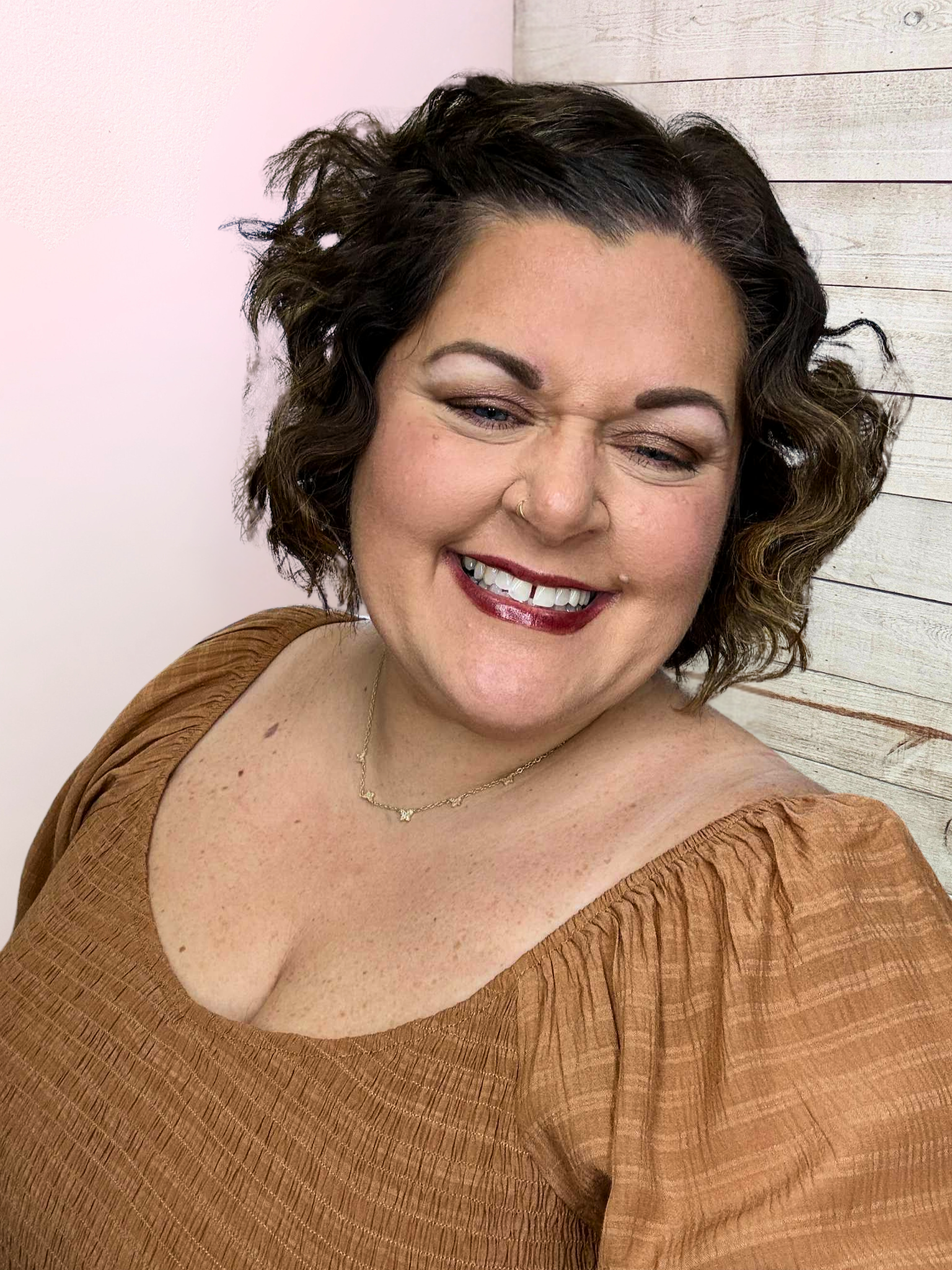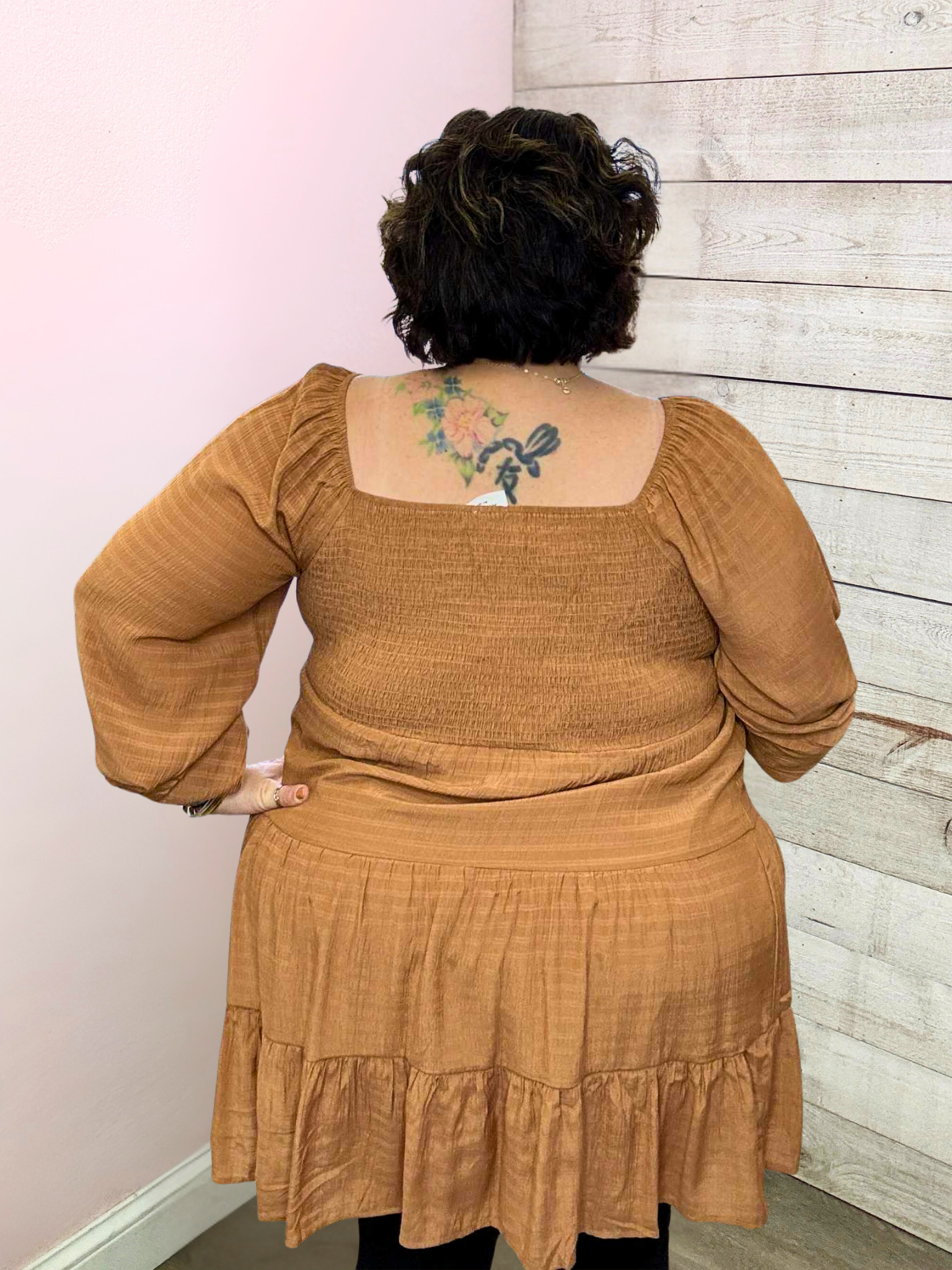 Camel colored midi dress featuring a smocked bust with an elastic neckline, long sleeves with elastic and ruffled wrists, and a tiered flowy hemline. Lined skirt. True to size!