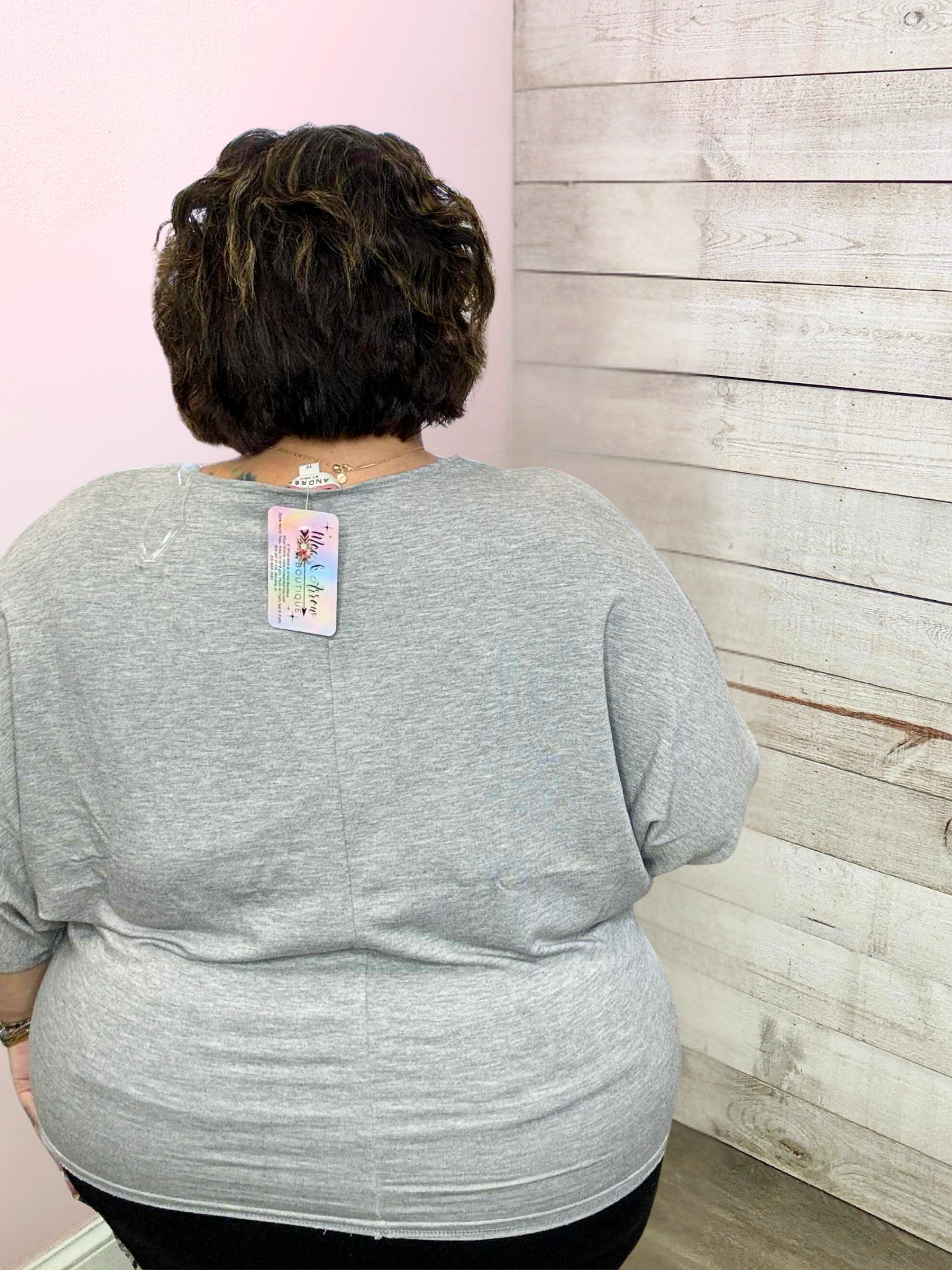 Grey top featuring a round neckline, short dolman sleeves, and a straight hemline.