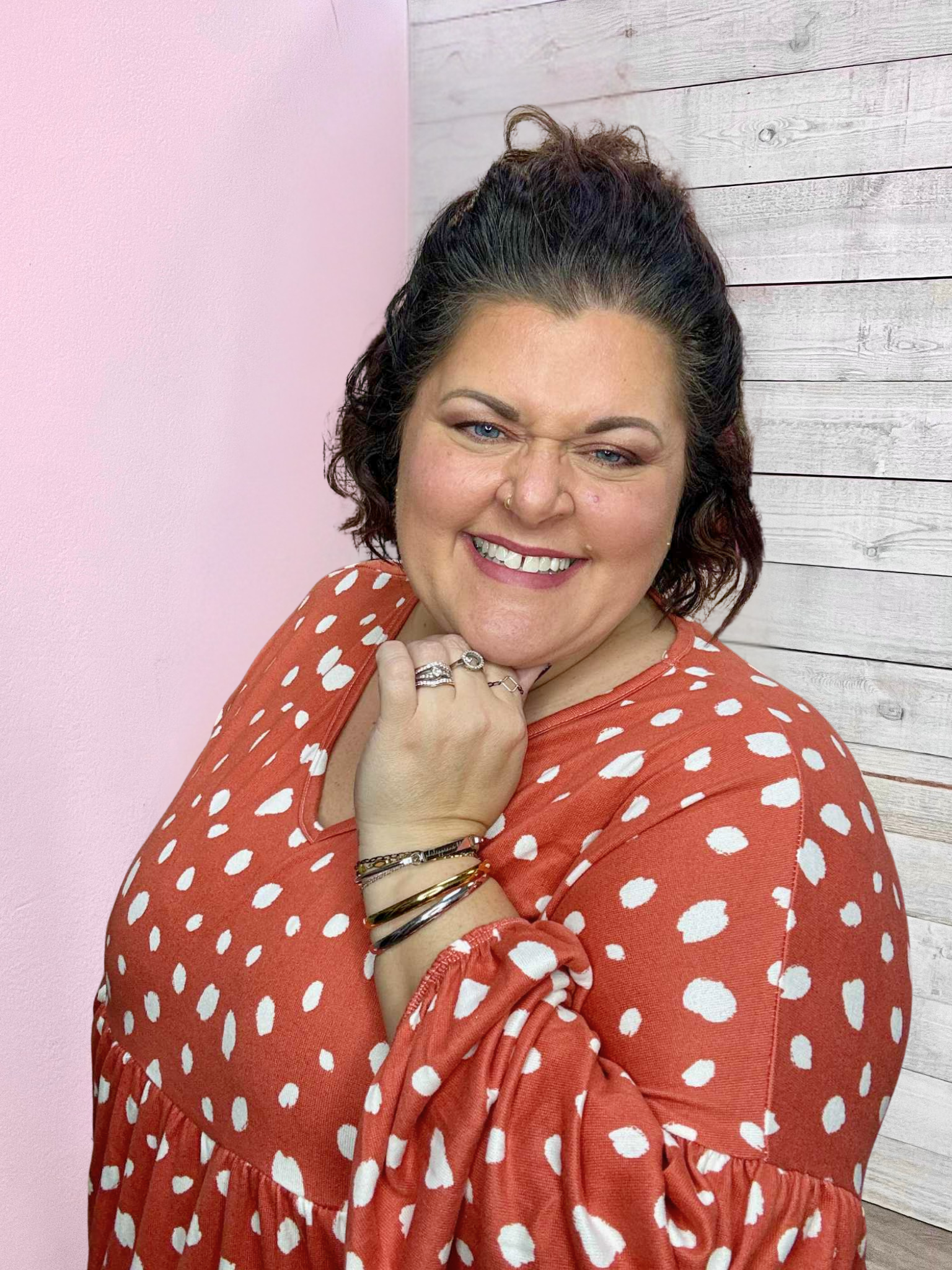 Rust babydoll top with an ivory polka dot print. The loose, tiered design adds a flattering silhouette, while the statement puff sleeves give it a touch of modern flair. Perfect for day-to-night wear, this versatile piece is ideal for dressing up or keeping it casual.