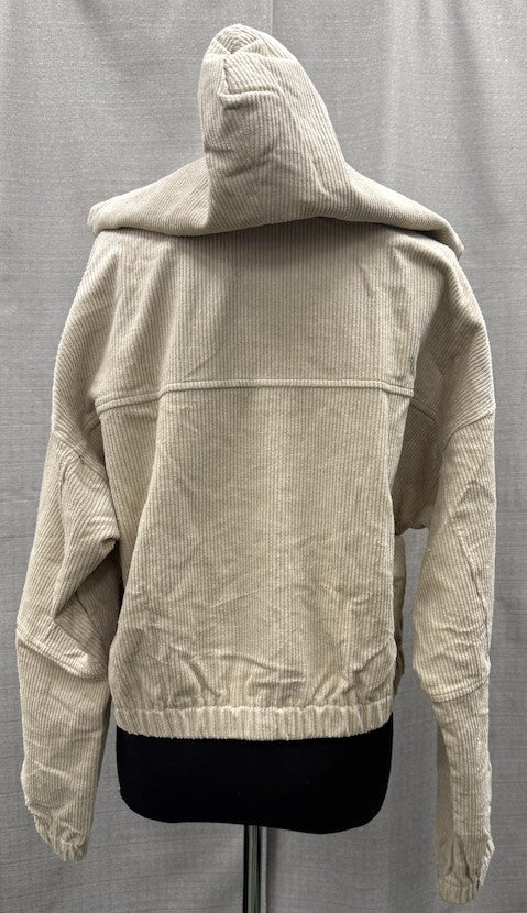 Taupe corduroy jacket featuring a zip-up front, drawstring hood, drop shoulders, side pockets, and a straight hemline—elastic hemline and cuffs.