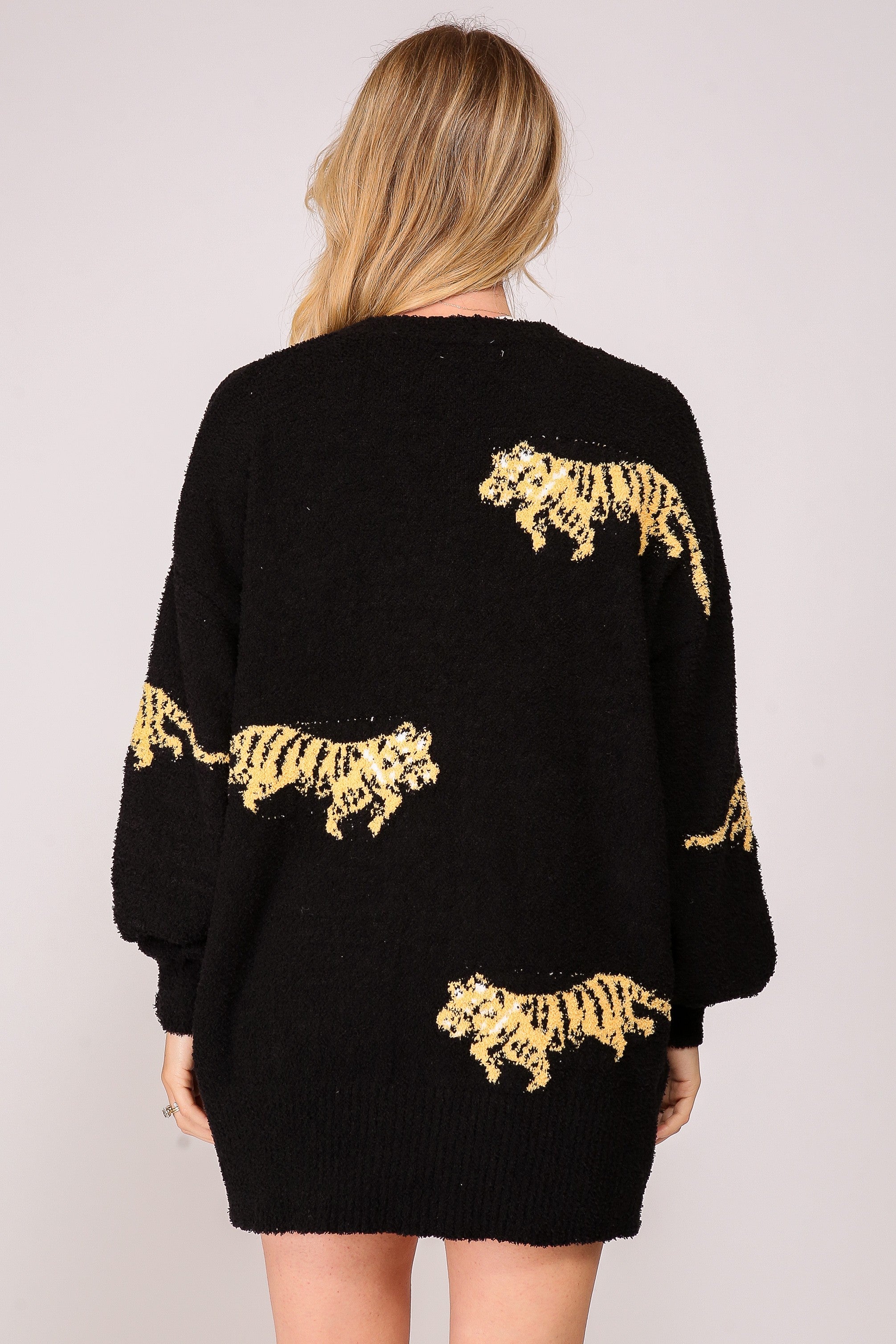 This cozy cardigan features a stylish jaguar print, and its open front design is perfect for layering in style during cooler weather. The long sleeves add an extra touch of warmth and comfort to this fashionable piece. Stay chic and cozy with this must-have addition to your wardrobe.