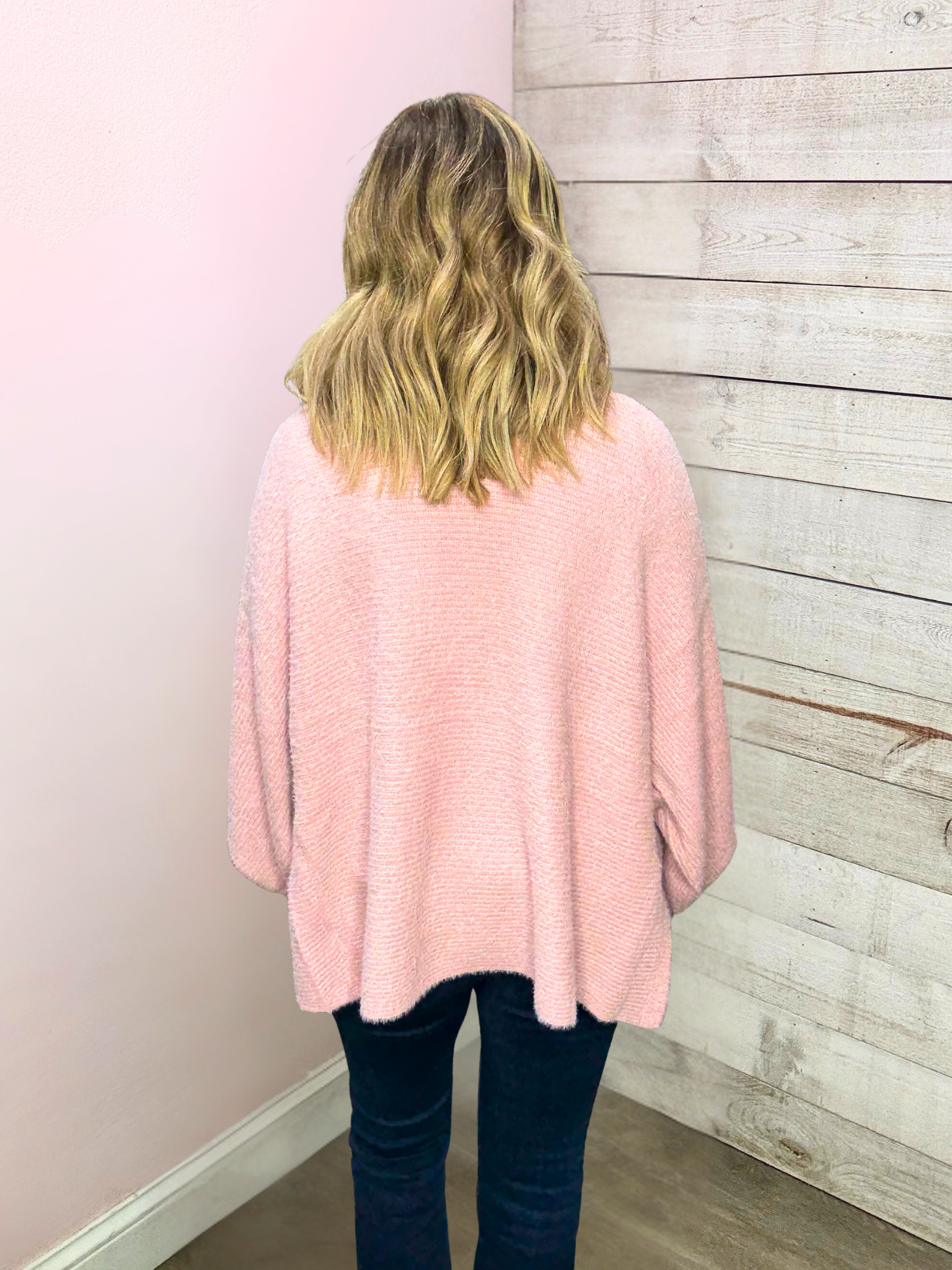 Soft pink cardigan featuring an open front, long dolman sleeves, and a curved hemline.