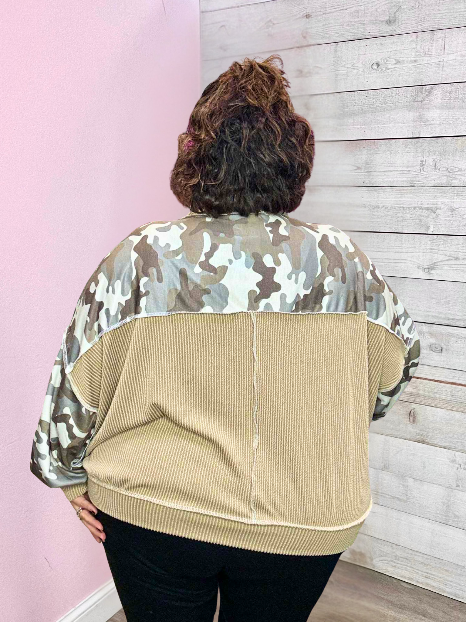 Camo top featuring a crew neckline with triangle detail, long sleeves with drop shoulder, and a straight hemline with a loose fit. French terry knit and reverse stitching.