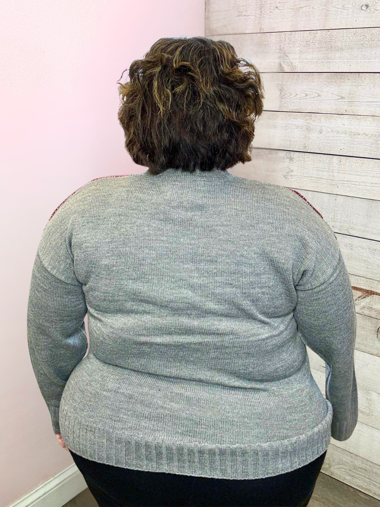 Charcoal, dark red, and tan Aztec printed sweater featuring a high neck, long sleeves, and a straight hemline.