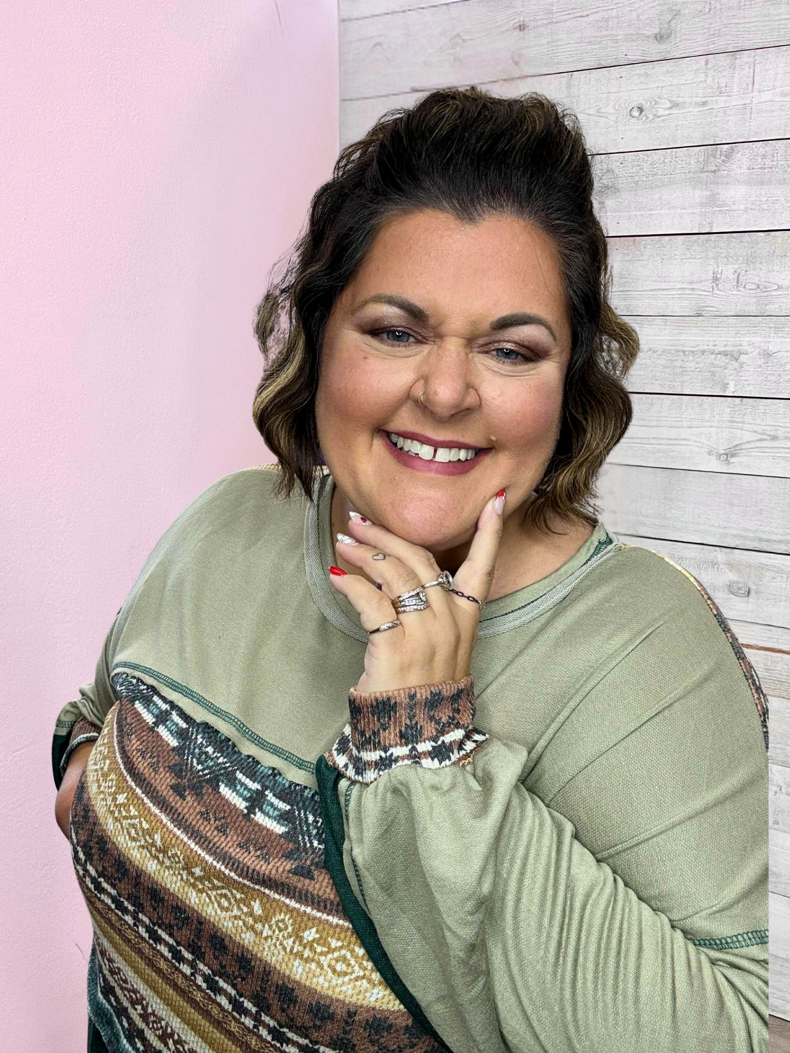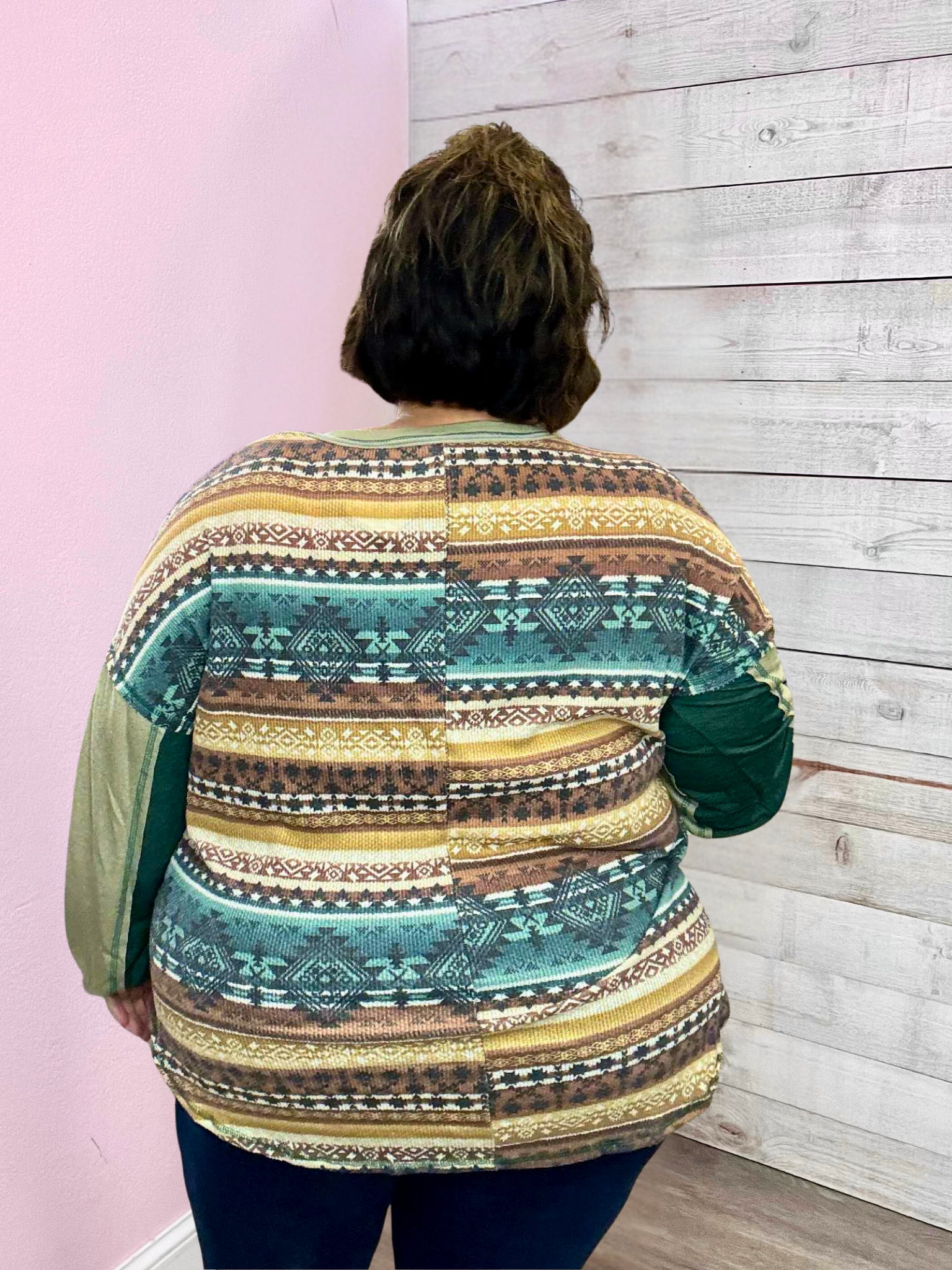 Sage top featuring a round neckline and a trendy color block design, this piece is adorned with an eye-catching Aztec print. The round hemline adds a flattering touch, while the long cuff sleeves provide a sophisticated finish. Ideal for any occasion, this top effortlessly combines fashion-forward aesthetics with everyday wearability.