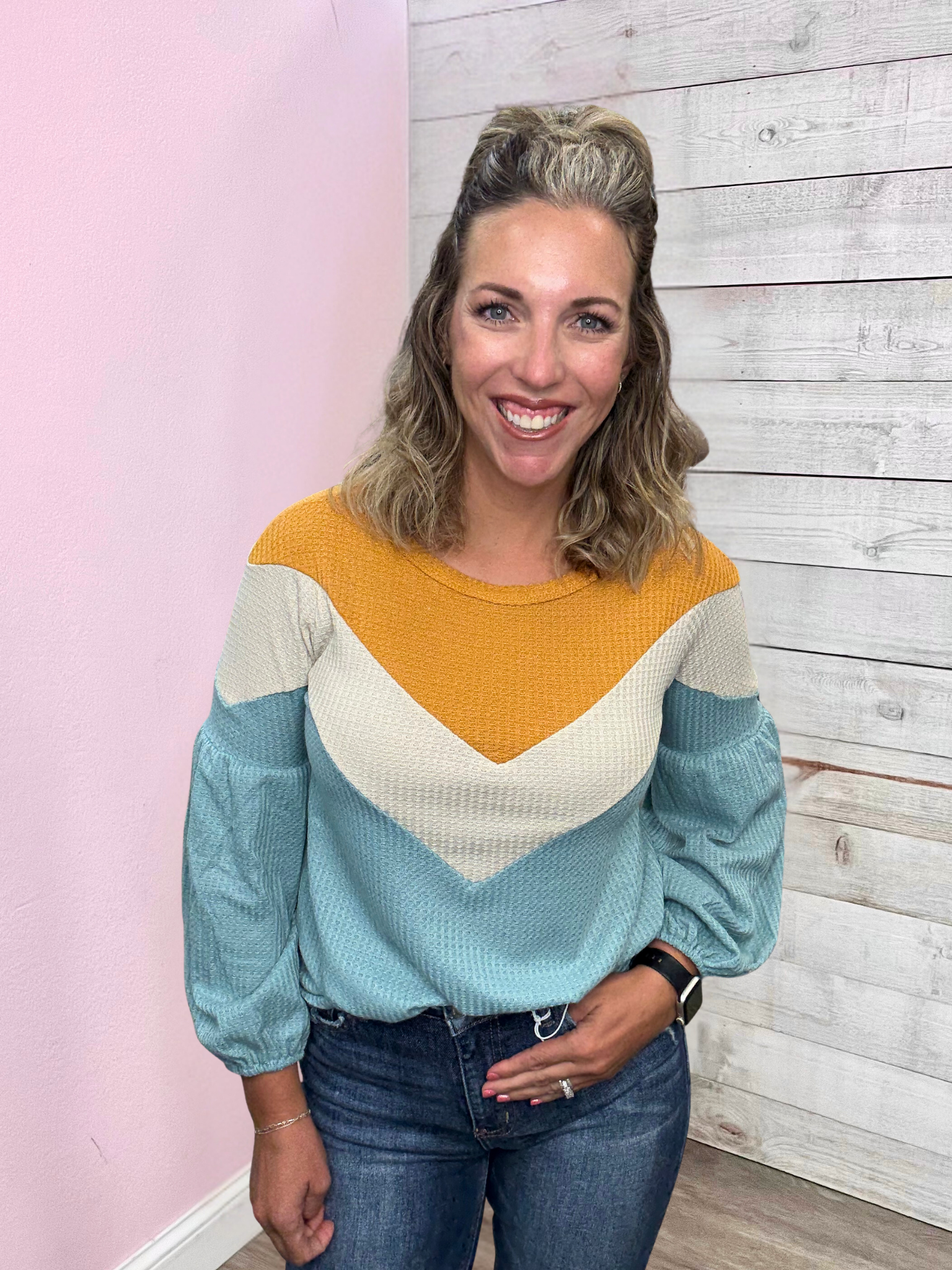 Mustard, tan, and mint chevron top featuring a round neckline, long bubble sleeves, and a curved hemline. Waffle knit texture.