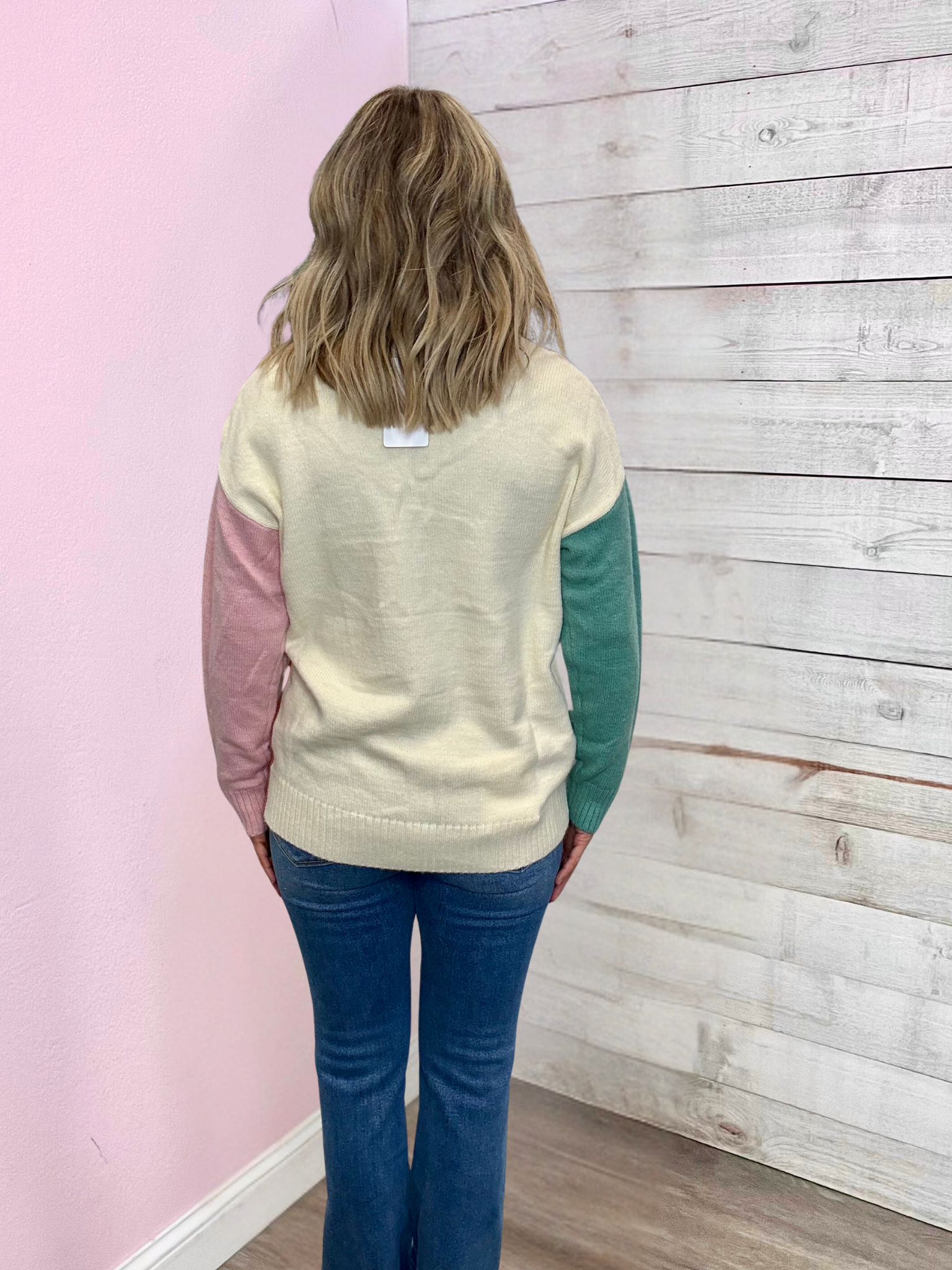 Multi color sweater cardigan featuring a v neckline, button down front, long sleeves, and a straight hemline.