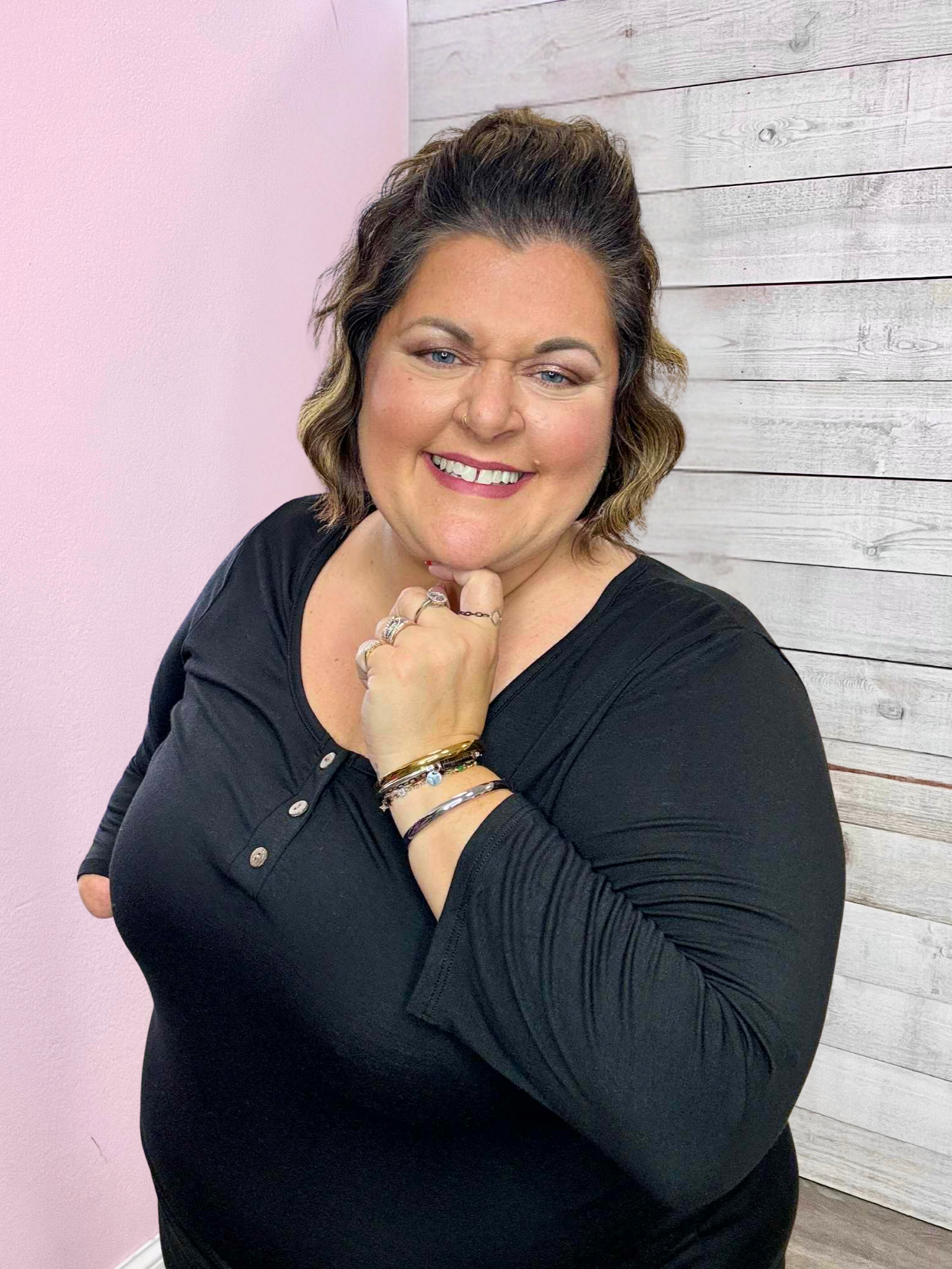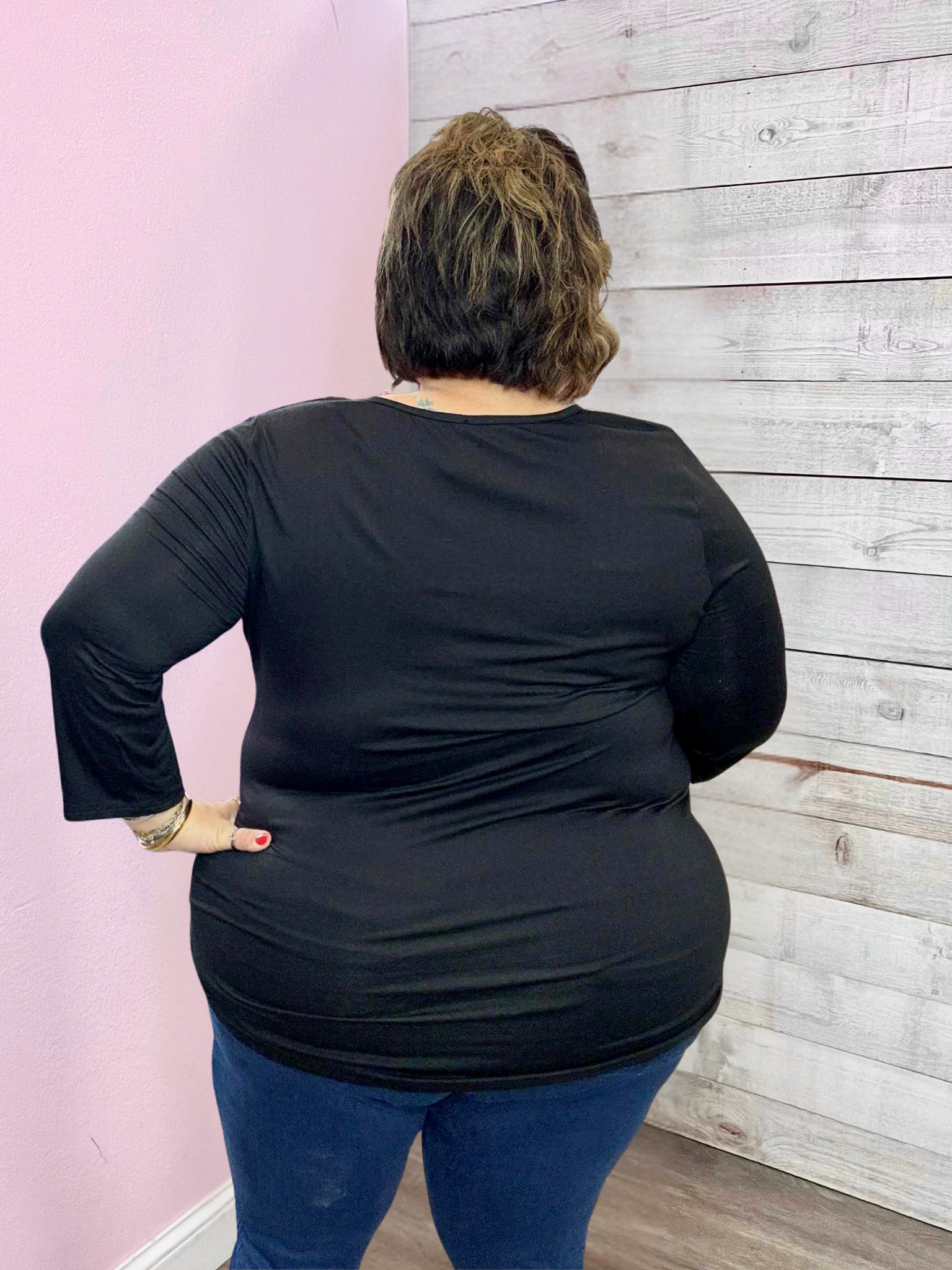 Solid black top featuring a scoop neckline with button details, 3/4 sleeves, and a dolphin hemline.
