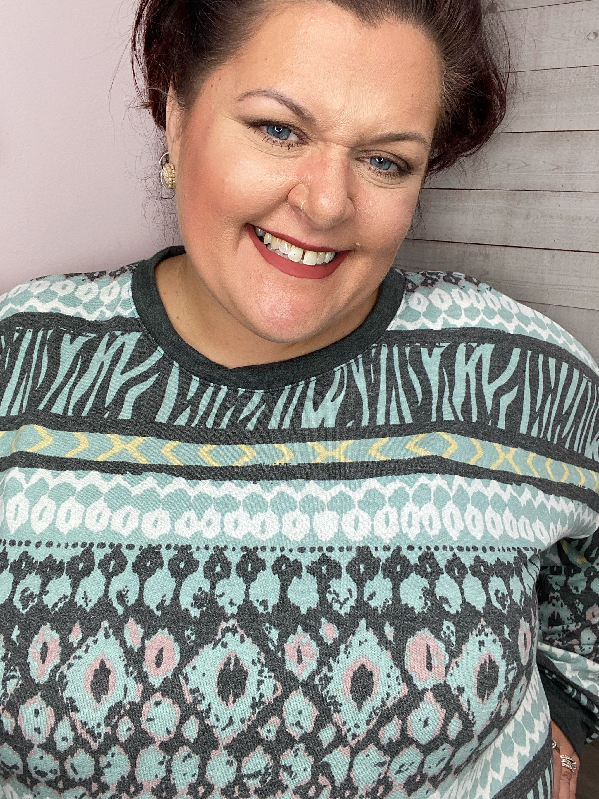 This mixed animal print top has so many beautiful colors. It is also very lightweight and soft, featuring a round neckline and side slits. True to size.