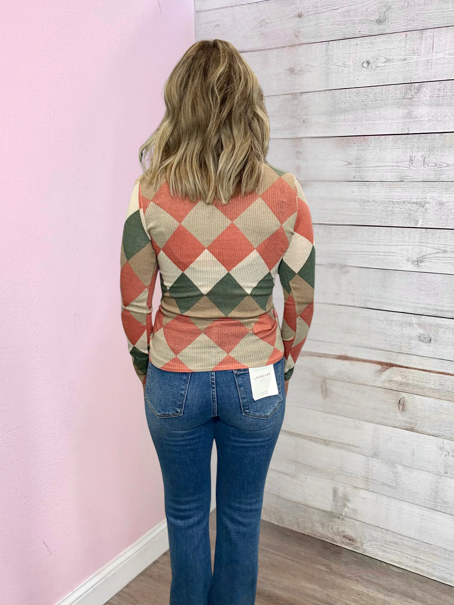 Green, orange, and brown argyle print top featuring a turtleneck, long sleeves, and a straight hemline. Ribbed texture.