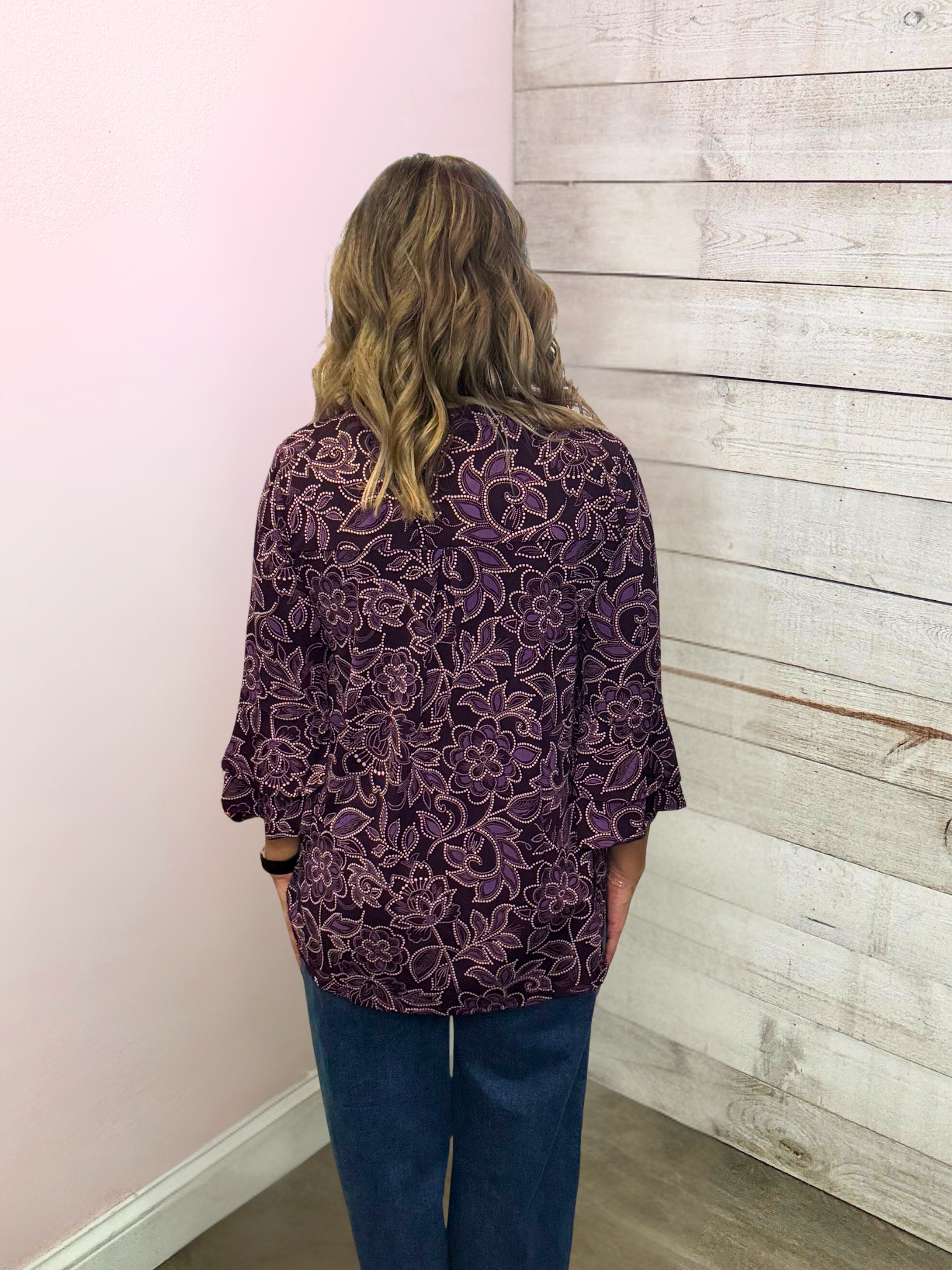 Meet the belled LIZZY! A fresh take on effortless elegance. Designed with a relaxed fit, this versatile top features a refined Lizzy neck and beautifully tiered bell sleeves that add a touch of romantic flair. Purple with a paisley print. True to size.