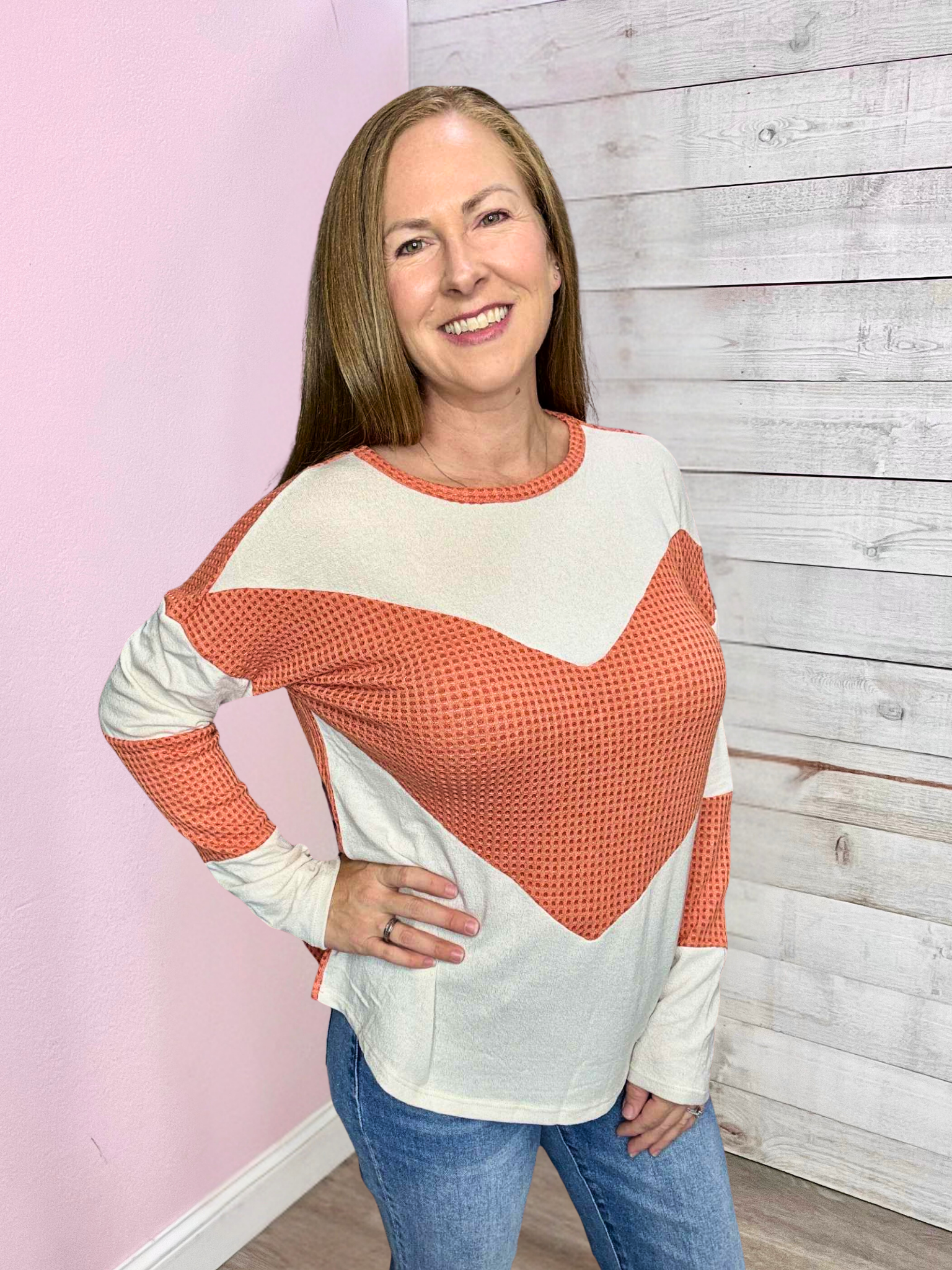 Soft waffle knit top with a bold chevron design in contrasting tones. Featuring a relaxed fit, dropped shoulders, and ribbed cuffs, this easygoing piece brings playful energy to your everyday wardrobe.