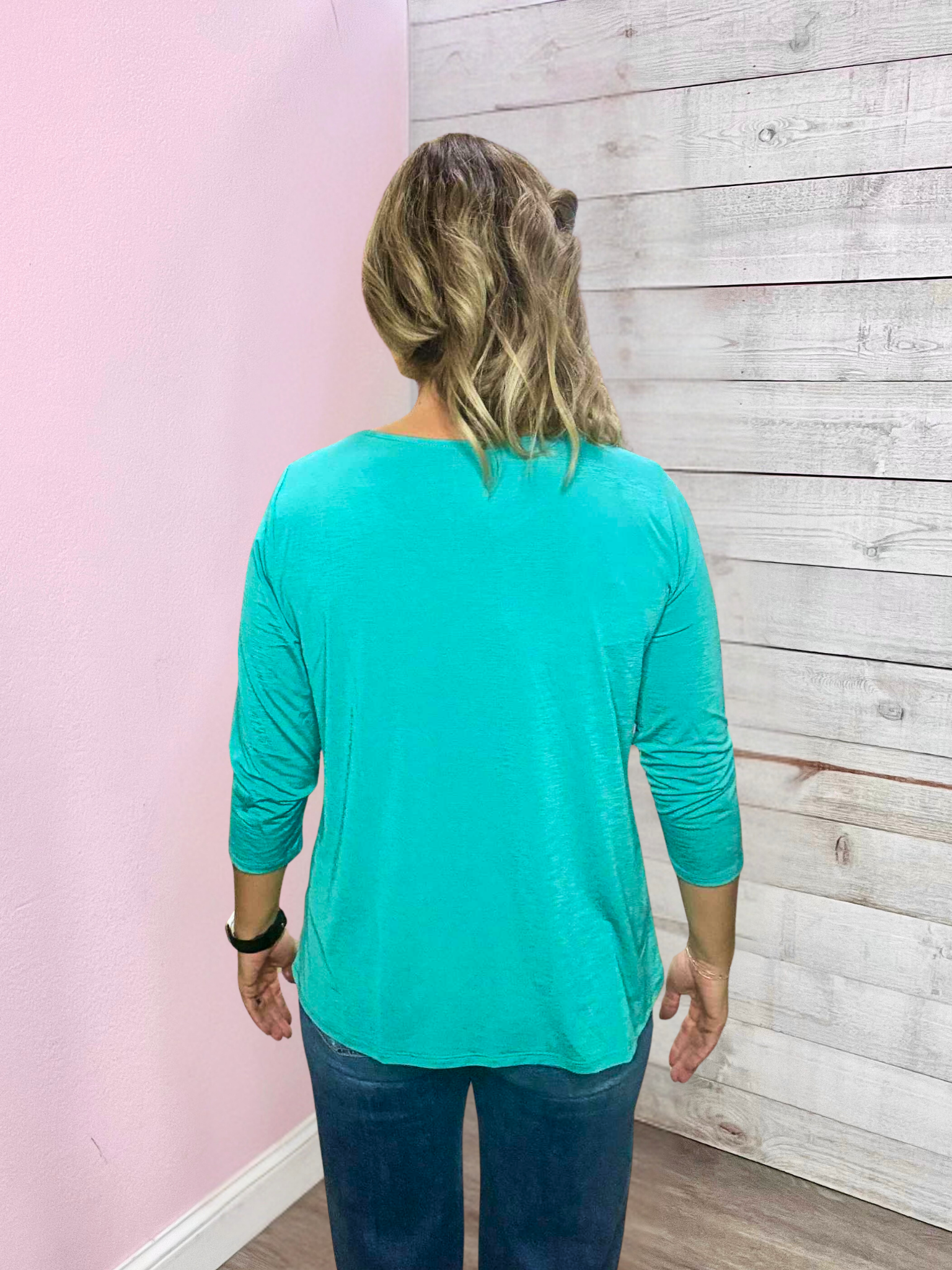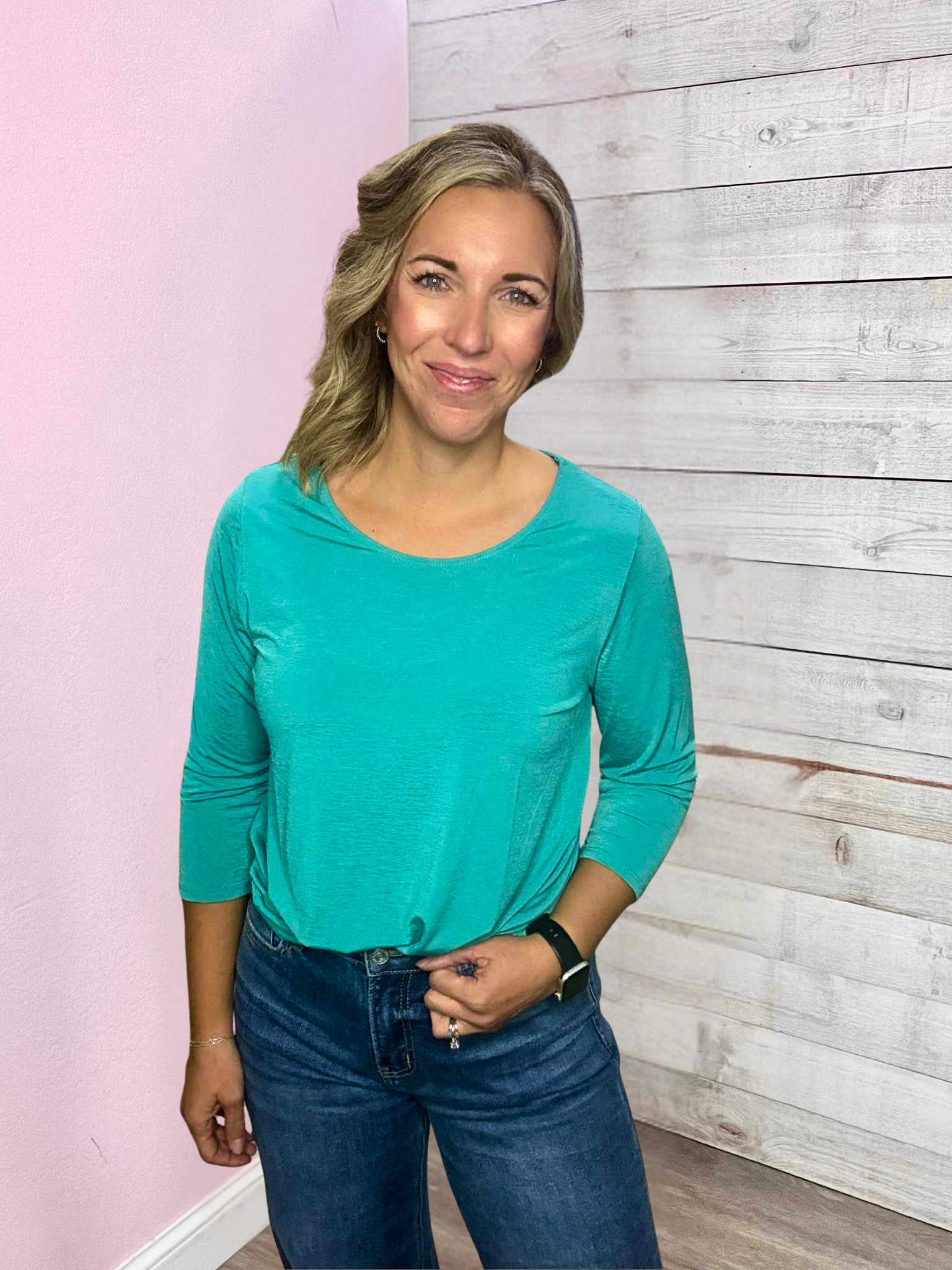 Classic poly blend top featuring a round neckline, 3/4" sleeves, and a straight hemline. Non-sheer, stretchy wrinkle-free fabric.