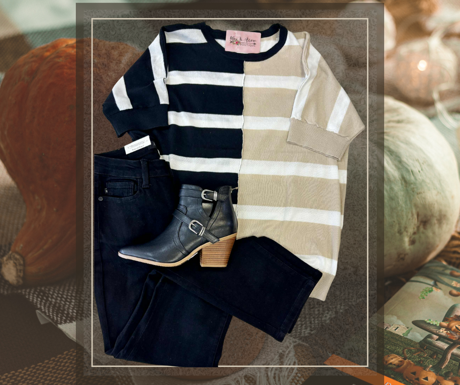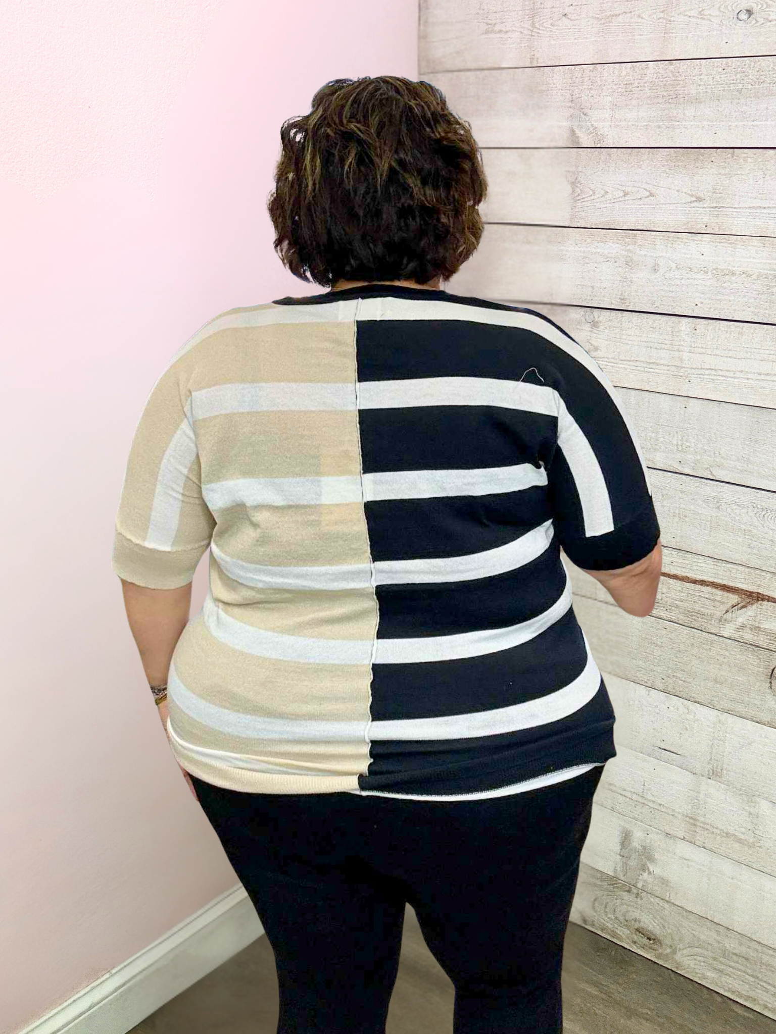 Half black and white stripe and half tan and white stripe top. Featuring a round neckline, short sleeves, and a straight hemline. Exposed seam down the middle to separate the colors. Lightweight sweater material.